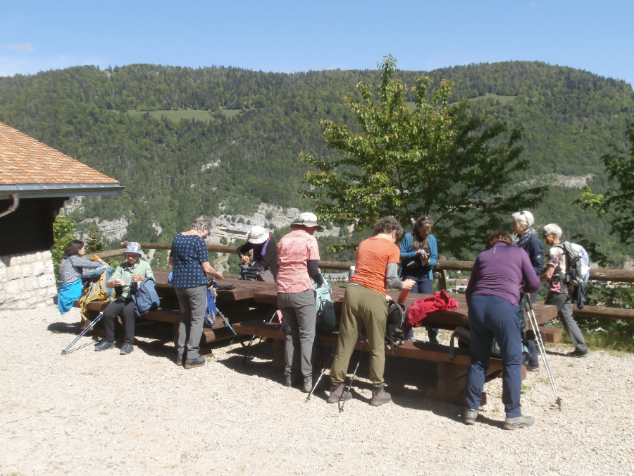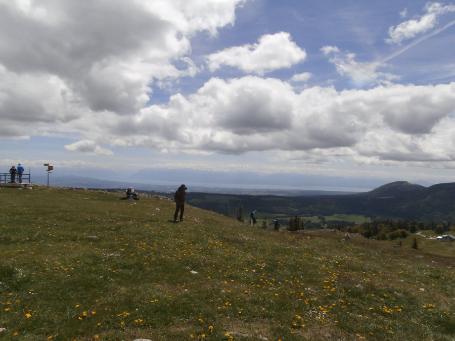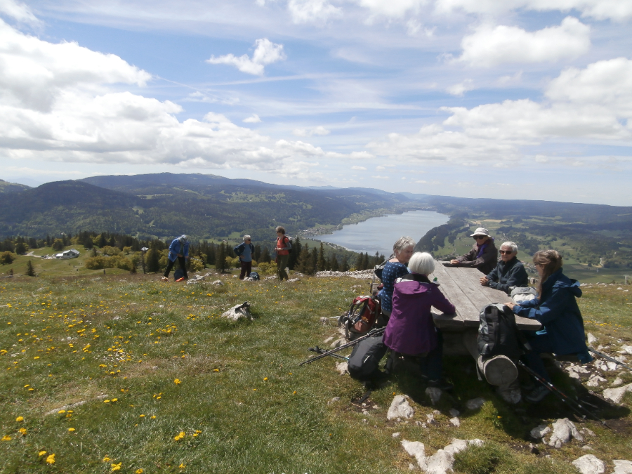 Bei der Mittagsrast kann die herrliche Aussicht bestaunt werden sowie der Genfer-, Neuenburger-, Bieler- und Murtensee und sowie der Lac de Joux und der Lac Brenet.
