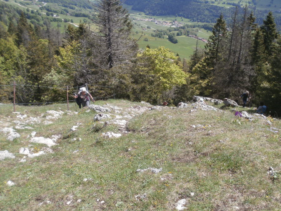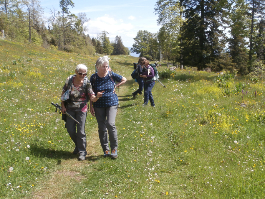 Nach einer eher durchzogenen Woche waren alle Teilnehmenden froh, dass heute die Sonne lacht. Unsere Tour beginnt in Vallorbe im Waadtländer Jura fast an der französischen Grenz. Nachdem wir den Ort durchquert haben, geht es auf abwechslungsreichen Wegen stetig bergauf. Nach einem etwas steileren Anstieg haben wir la Mâche erreicht und unsere Ziel den Dent de Vaulion vor uns. Zuerst führt der Weg über Weiden und noch ein Stück durch den Wald, bevor es nochmals steil bergauf geht und bald der Gipfel erreicht ist.