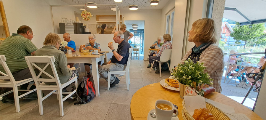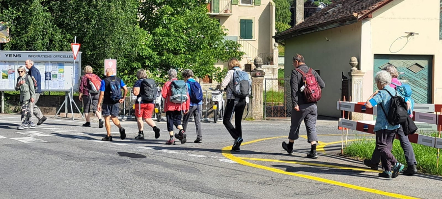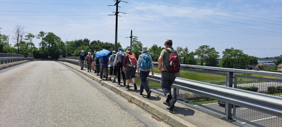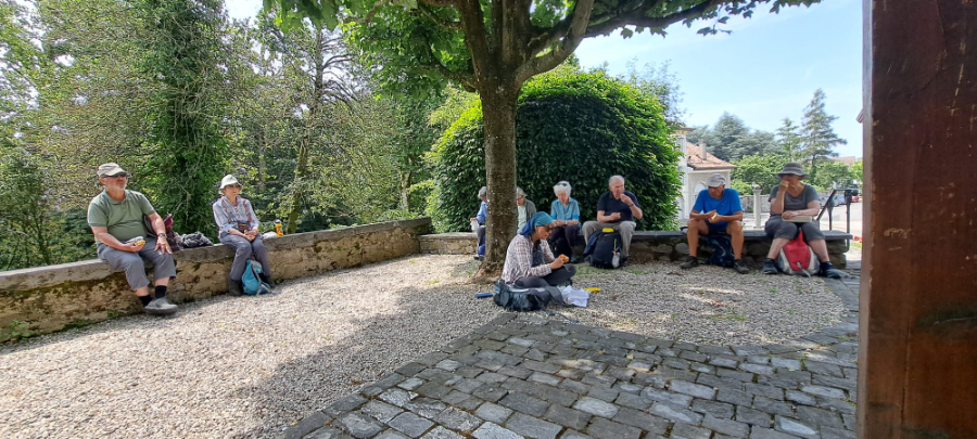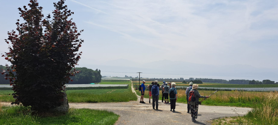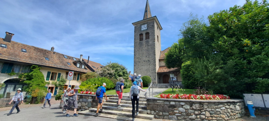 Auf der Wanderung im Waadtland ist es nicht der Regen, sondern die Hitze, die uns einiges abverlangt. Nach dem Startkaffee in Yens wandern wir durch Reben und Obstplantagen und durchqueren bald das Dörfchen Villars-sous-Yens mit seinen schönen alten Bauernhäusern. Von Moulin de Villars steigt der Weg bergauf durch den Wald und danach sanft bergab über die Felder. Vor der Kirche im Städtchen Etoy unter schattigen Bäumen machen wir Mittagsrast. Die Kirche stammt zu bedeutenden Teilen aus dem 13. Jahrhundert und ist umgeben von alten Herrenhäusern, die an die Zeit der bernischen Herrschaft in der Waadt erinnern. Auf dem letzten Wegstück bis Allaman brennt die Sonne heiss auf uns nieder. Müde und verschwitzt erreichen wir unser Ziel. Froh, am Schatten zu sein, geniessen wir unseren Schlusstrunk in einer schönen Gartenwirtschaft. Wir danken Oscar Siegenthaler ganz herzlich für die Wanderung in einer Landschaft, welche für die meisten von uns unbekannt war.