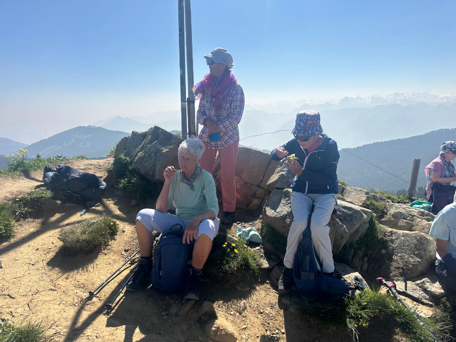 Der Fürstein kam näher und wir konnten den schmalen steilen Felsenpfad sehen, der zum Gipfelkreuz führte. Und um 11.35 Uhr wurden wir auf 2040 m von einem kühlen Wind begrüsst. Nach einer kurzen Mittagspause machten wir uns an den Abstieg. Die 620 Höhenmeter, die wir aufgestiegen waren, mussten wir nun absteigen. Der Weg war steil und trocken, und leider stürzte eine Wanderin. Sie konnte mit uns bis zum Seewenseeli (1689m) wandern, wo eine Familie ein Picknick machte. Maya überredete den Fahrer, unsere verletzte Wanderin und eine weitere Person zur Bushaltestelle hinunter zu bringen, während der Rest der Gruppe die letzten 4 km in hohem Tempo zurücklegte. Das letzte Postauto des Tages fuhr um 14.12 Uhr ab, und wir wollten diesen Bus noch erwischen. Die Wanderer waren so schnell, dass wir eine gute halbe Stunde Zeit hatten, uns zu entspannen und den Tag Revue passieren zu lassen, bevor der Bus kam!