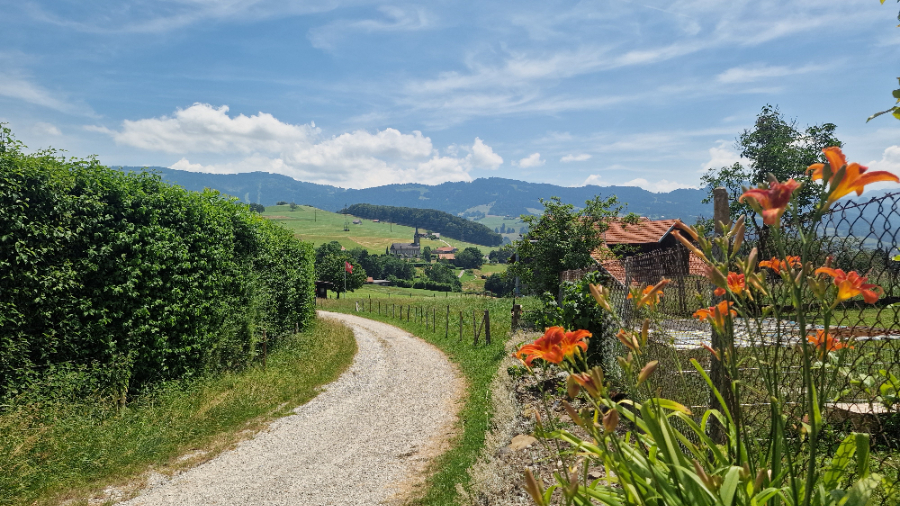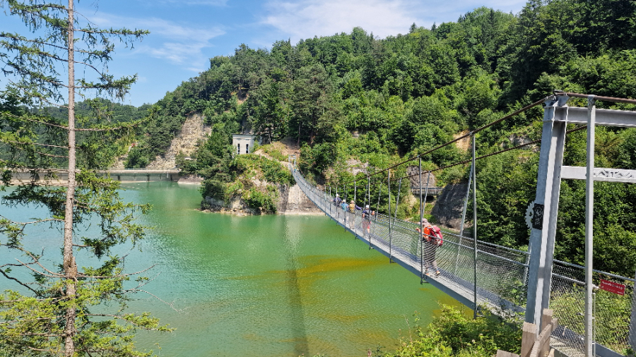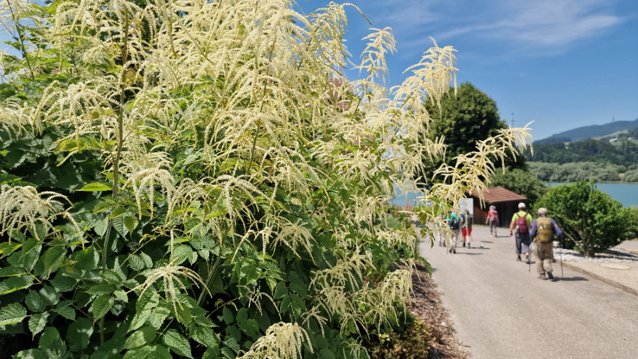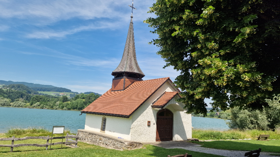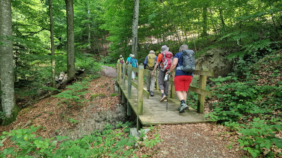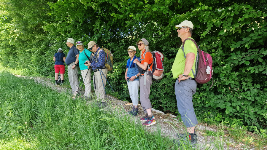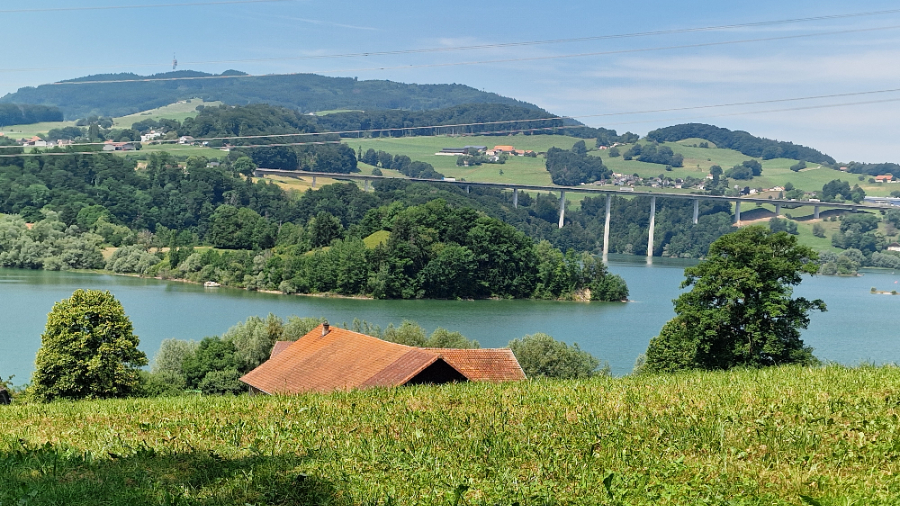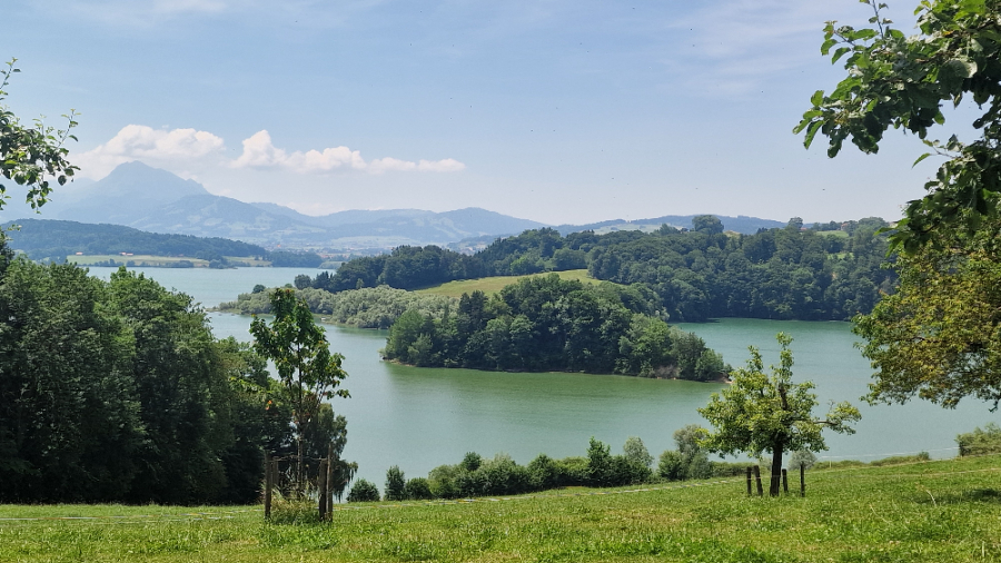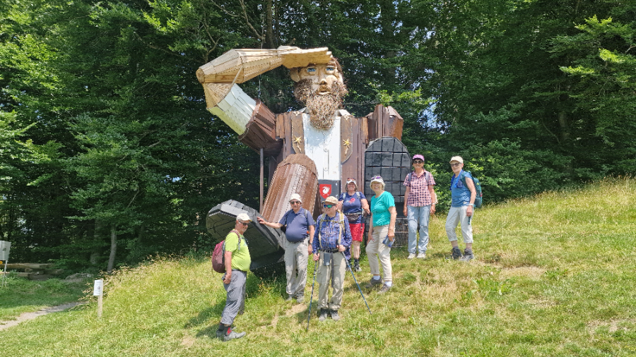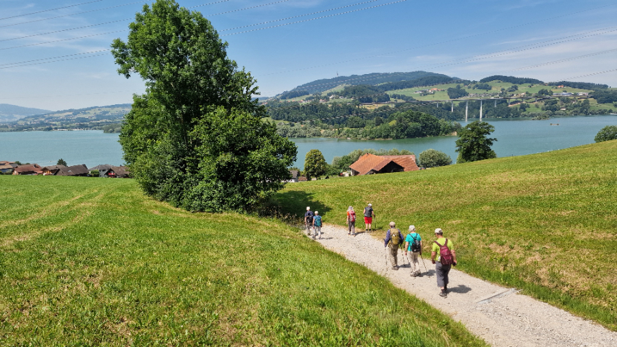 Nach Zug- und Busfahrt durchs Freiburgerland eröffnet das Startkafi unsere Wanderung. Zuerst geht’s durch das stattliche Dorf La Roche. Dank leichter Bise merkt man die Wärme kaum. Und schon bald steigen wir im Wald entlang des leise murmelnden Ruisseau du Stoutz hinunter zur Brücke über den R. de la Serbache. Nun steigt der Weg, zum Glück auch im Schatten, wieder an. Ein Wegstück an der Sonne und der Weg führt uns hinunter Richtung See. Schon taucht die Turmspitze der Chapelle du Thusy direkt am Seeufer auf. An einem stattlichen Tisch bei einer grossen Linde neben der Kapelle setzen wir uns und verzehren das mitgebrachte Picnic. Der See ladet einige Unentwegte zum Baden ein. Auch Surfbretter werden aufgeblasen. Uns aber ladet der See noch nicht zum Bade. Das Wasser wäre uns noch etwas zu kalt und auch zu trübe. Wir ziehen nach ausgiebiger Rast weiter, hinauf nach Pont-la-Ville. Ansehnliche Bauernhäuser und die grosse Kirche beeindrucken uns. Auch ein grosser 18 Loch Golfplatz befindet sich hier. Der Rasen sauber gemäht, aber Golfer sind keine zu sehen. Zum Glück, denn der Weg führt zwischen einzelnen Tees durch. Und so brauchen wir auch keine Angst vor herumfliegenden Golfbällen zu haben. Schon bald taucht eine unerwartete Überraschung auf. Am Waldrand sitzt ein übergrosser hölzerner Senn mit wildem Bart und begrüsst die Vorübergehenden. Auf Knopfdruck gibt er auch den "Ranz-des-Vaches" oder «Les Baisers de ma Mere" zum Besten. Wir hören ihm zu und es werden Erinnerungsbilder geknipst. Belustigt ziehen wir weiter, durch den Wald ob dem See, der 105 m langen Hängebrücke bei der Barrage am Seeende zu. Ca. 15m ob dem Wasser schweben wir hier ans andere Ufer bei der Staumauer. Über die Mauer und noch ein kurzer, schweisstreibender Effort aufwärts, dann ist der Bushalt in Rossens erreicht. Von hier bringt uns der tpf Bus zurück nach Fribourg und bald sind wir mit der Bahn wieder zurück in Bern. Es war ein schöner sommerlicher Wandertag. Ich danke allen die mitgewandert sind und Doris für die Bildreportage.