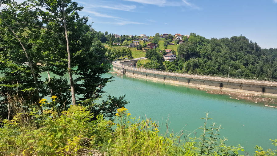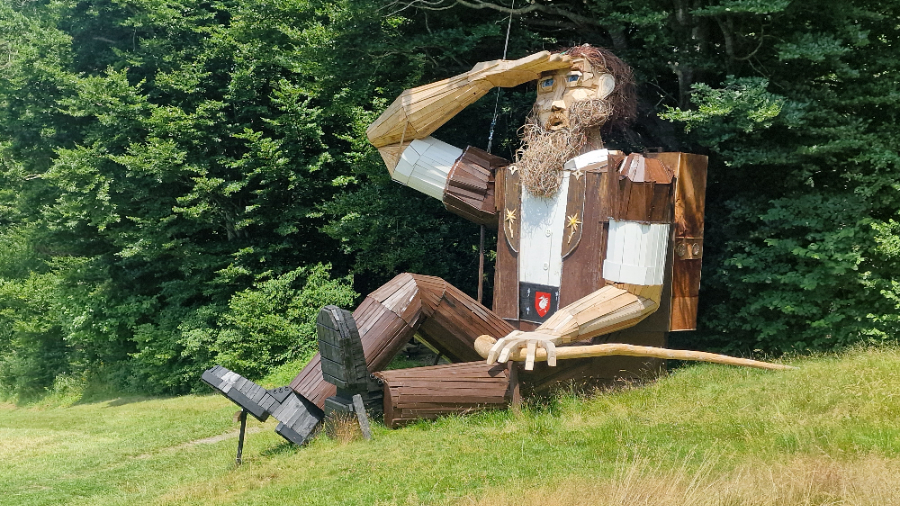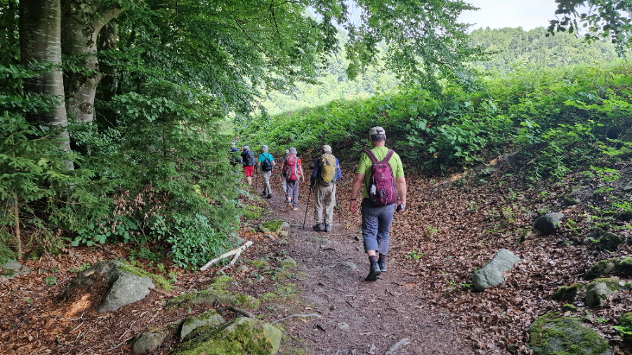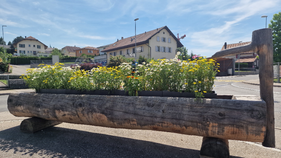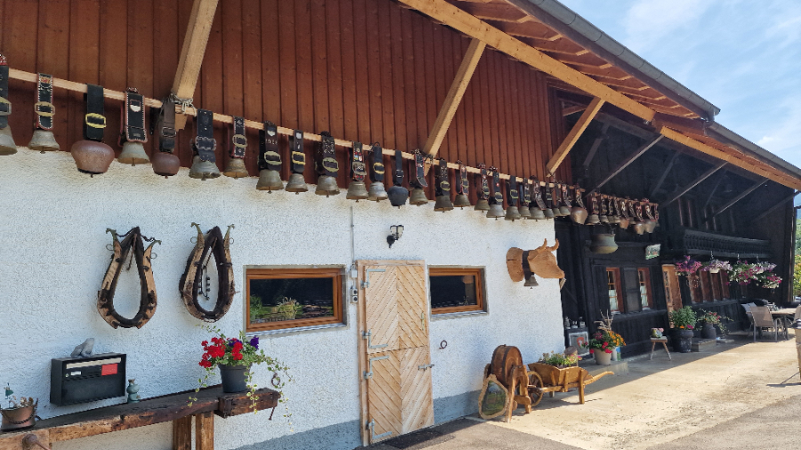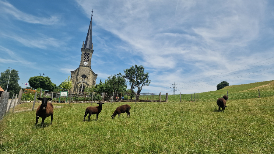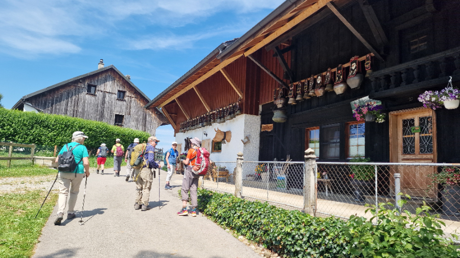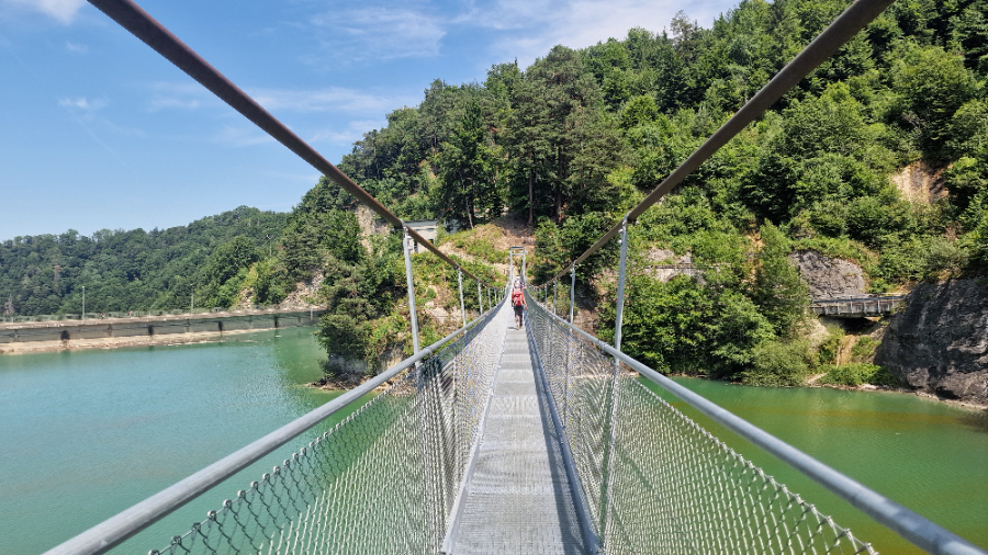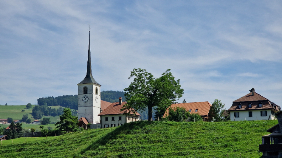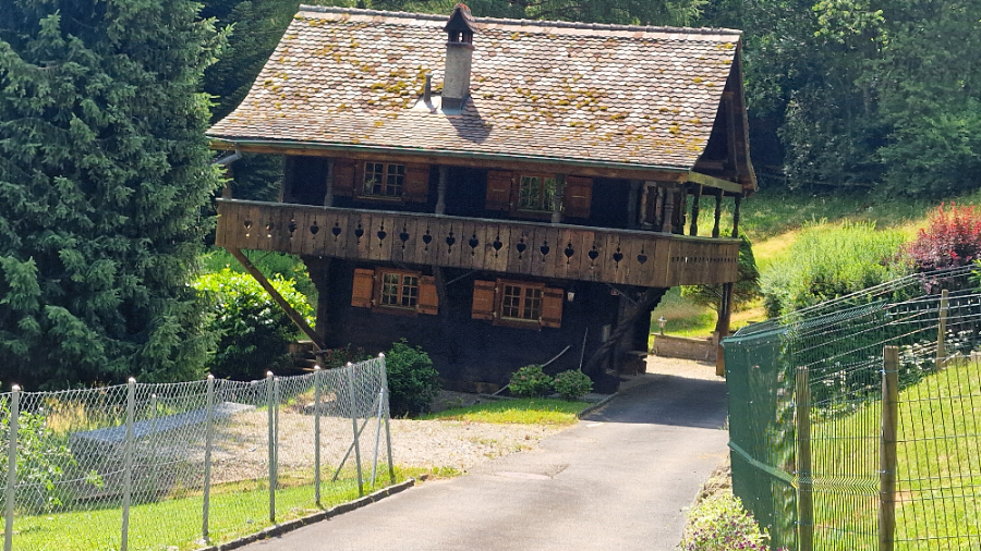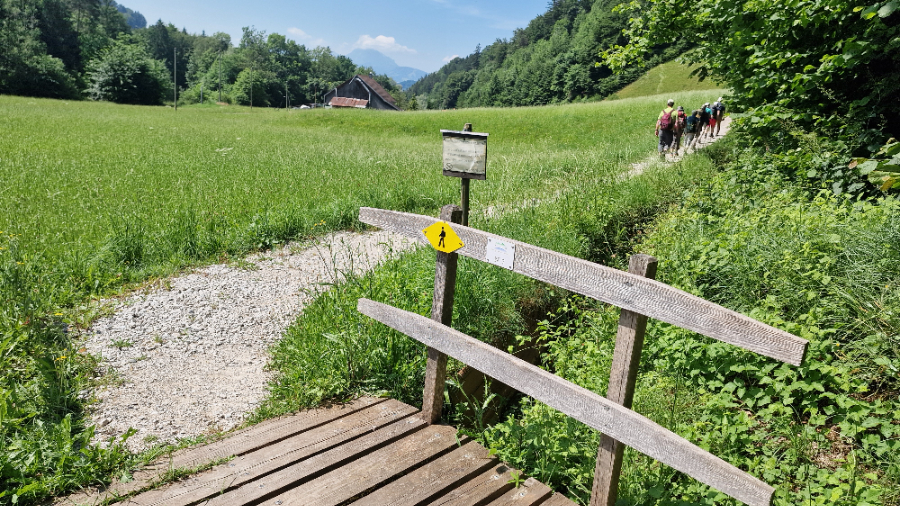 Nach Zug- und Busfahrt durchs Freiburgerland eröffnet das Startkafi unsere Wanderung. Zuerst geht’s durch das stattliche Dorf La Roche. Dank leichter Bise merkt man die Wärme kaum. Und schon bald steigen wir im Wald entlang des leise murmelnden Ruisseau du Stoutz hinunter zur Brücke über den R. de la Serbache. Nun steigt der Weg, zum Glück auch im Schatten, wieder an. Ein Wegstück an der Sonne und der Weg führt uns hinunter Richtung See. Schon taucht die Turmspitze der Chapelle du Thusy direkt am Seeufer auf. An einem stattlichen Tisch bei einer grossen Linde neben der Kapelle setzen wir uns und verzehren das mitgebrachte Picnic. Der See ladet einige Unentwegte zum Baden ein. Auch Surfbretter werden aufgeblasen. Uns aber ladet der See noch nicht zum Bade. Das Wasser wäre uns noch etwas zu kalt und auch zu trübe. Wir ziehen nach ausgiebiger Rast weiter, hinauf nach Pont-la-Ville. Ansehnliche Bauernhäuser und die grosse Kirche beeindrucken uns. Auch ein grosser 18 Loch Golfplatz befindet sich hier. Der Rasen sauber gemäht, aber Golfer sind keine zu sehen. Zum Glück, denn der Weg führt zwischen einzelnen Tees durch. Und so brauchen wir auch keine Angst vor herumfliegenden Golfbällen zu haben. Schon bald taucht eine unerwartete Überraschung auf. Am Waldrand sitzt ein übergrosser hölzerner Senn mit wildem Bart und begrüsst die Vorübergehenden. Auf Knopfdruck gibt er auch den "Ranz-des-Vaches" oder «Les Baisers de ma Mere" zum Besten. Wir hören ihm zu und es werden Erinnerungsbilder geknipst. Belustigt ziehen wir weiter, durch den Wald ob dem See, der 105 m langen Hängebrücke bei der Barrage am Seeende zu. Ca. 15m ob dem Wasser schweben wir hier ans andere Ufer bei der Staumauer. Über die Mauer und noch ein kurzer, schweisstreibender Effort aufwärts, dann ist der Bushalt in Rossens erreicht. Von hier bringt uns der tpf Bus zurück nach Fribourg und bald sind wir mit der Bahn wieder zurück in Bern. Es war ein schöner sommerlicher Wandertag. Ich danke allen die mitgewandert sind und Doris für die Bildreportage.