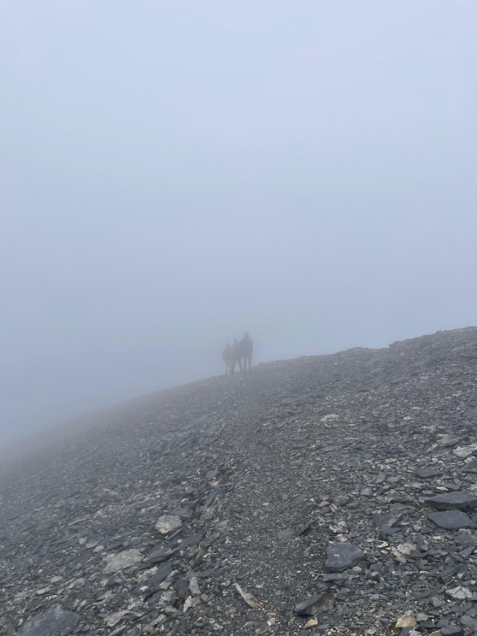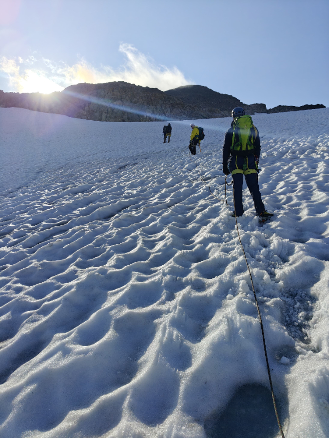 Am nächsten Morgen starteten wir um 5 Uhr in Richtung Krönten. Aufgrund der weiterhin instabilen Wetterlage entschieden wir uns für einen frühen Aufbruch. Zügig erreichten wir den Gletscher, auf dem wir das Gelernte direkt anwenden konnten. Es folgten ein kurzes Geröllfeld sowie eine Seillänge einfacher, aber genussvoller Kletterei bis zum Gipfelkreuz. Die angeblich prachtvolle Aussicht blieb uns leider aufgrund dichten Nebels verwehrt. Der Abstieg verlief reibungslos, so dass wir bereits um 14 Uhr zurück auf der Hütte unseren wohlverdienten „suren Moscht“ geniessen konnten.