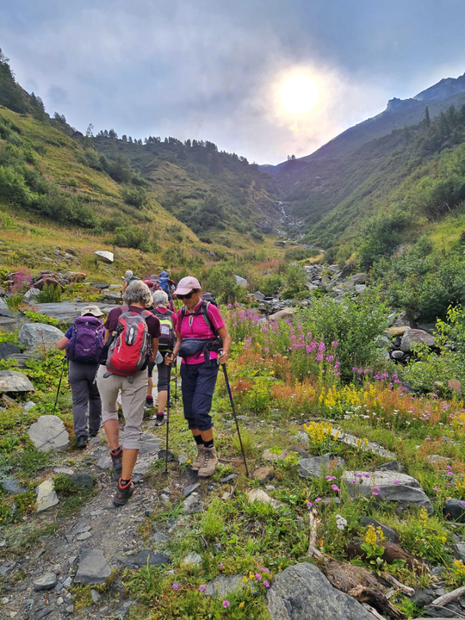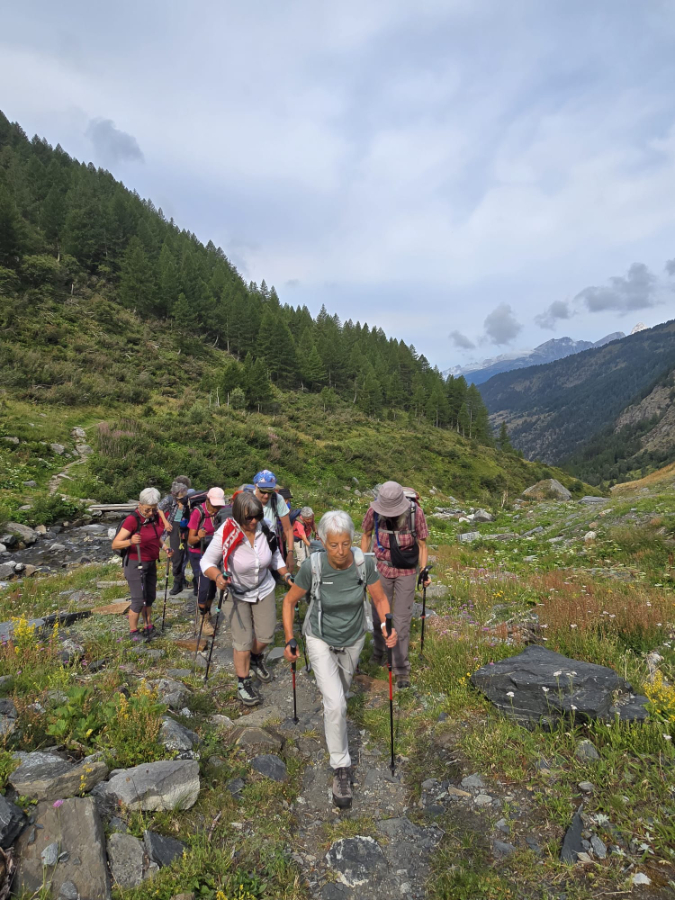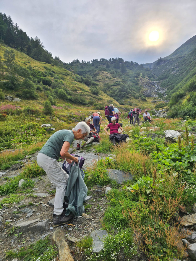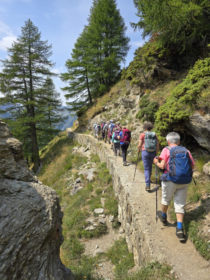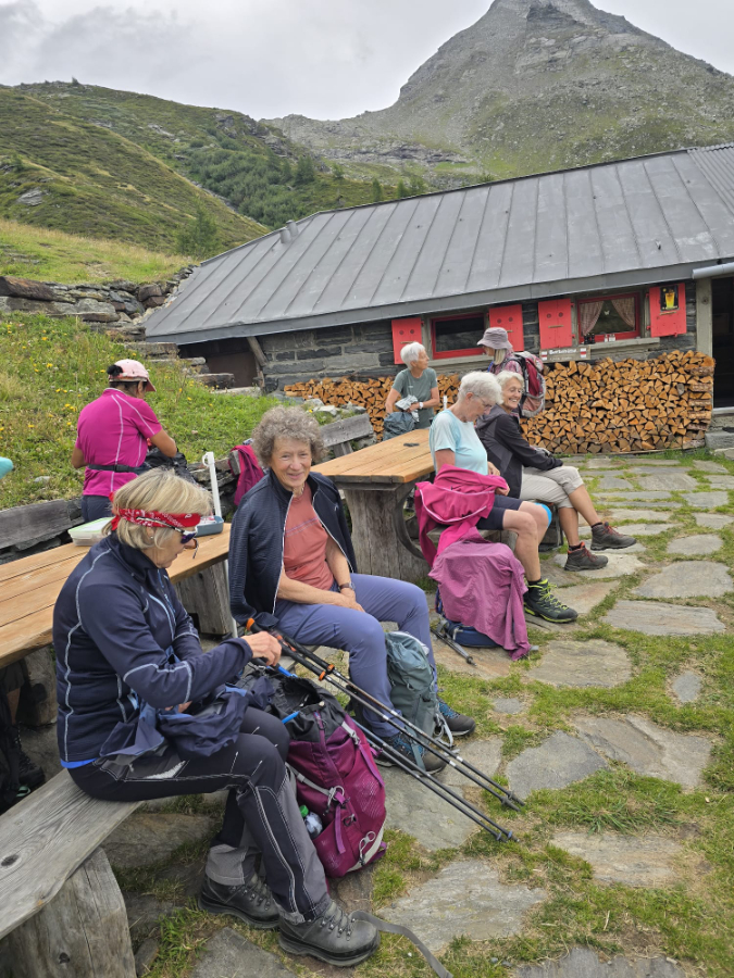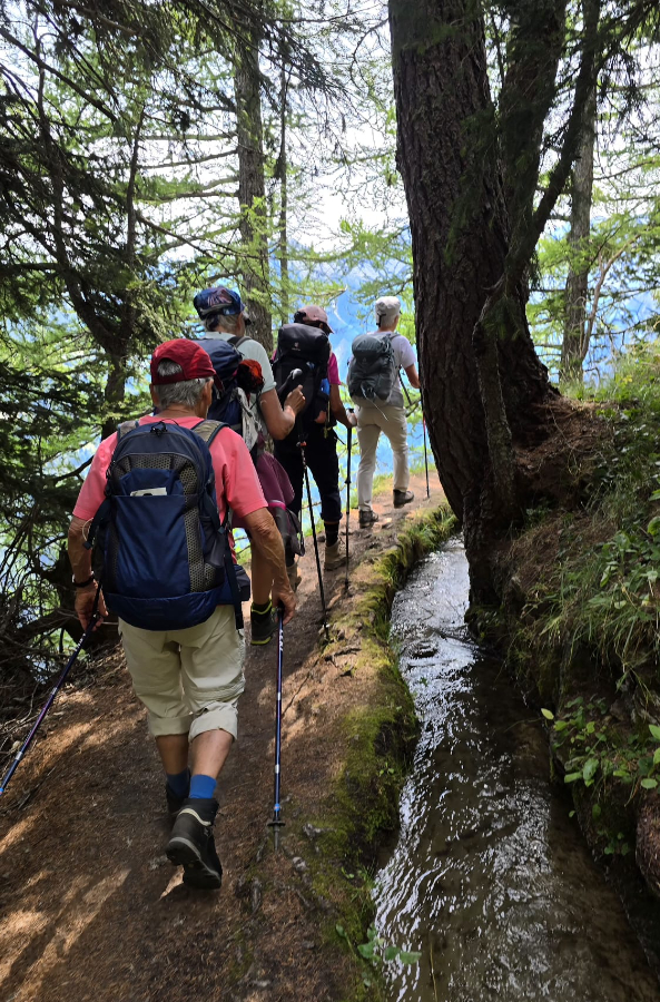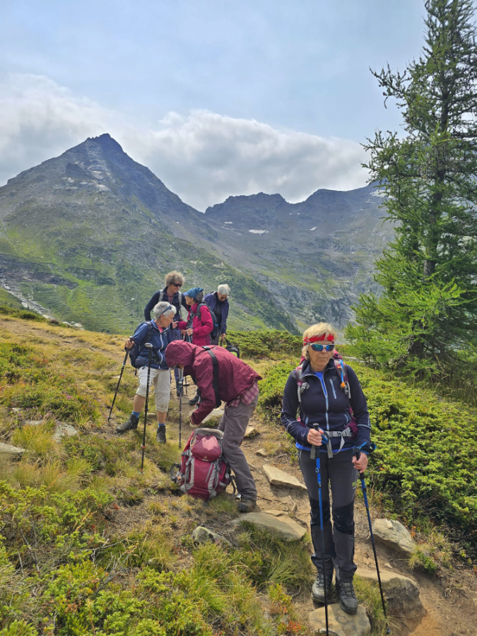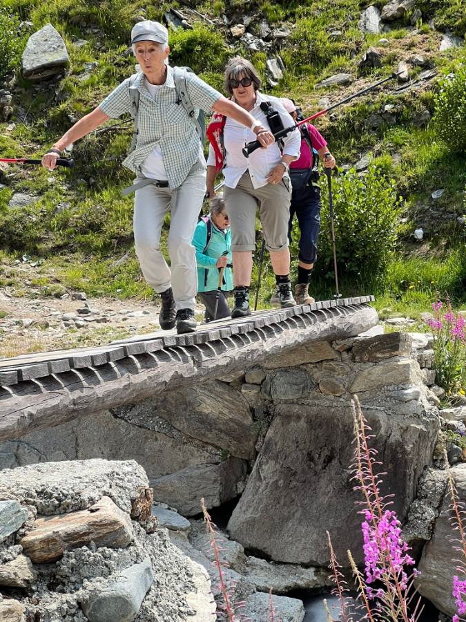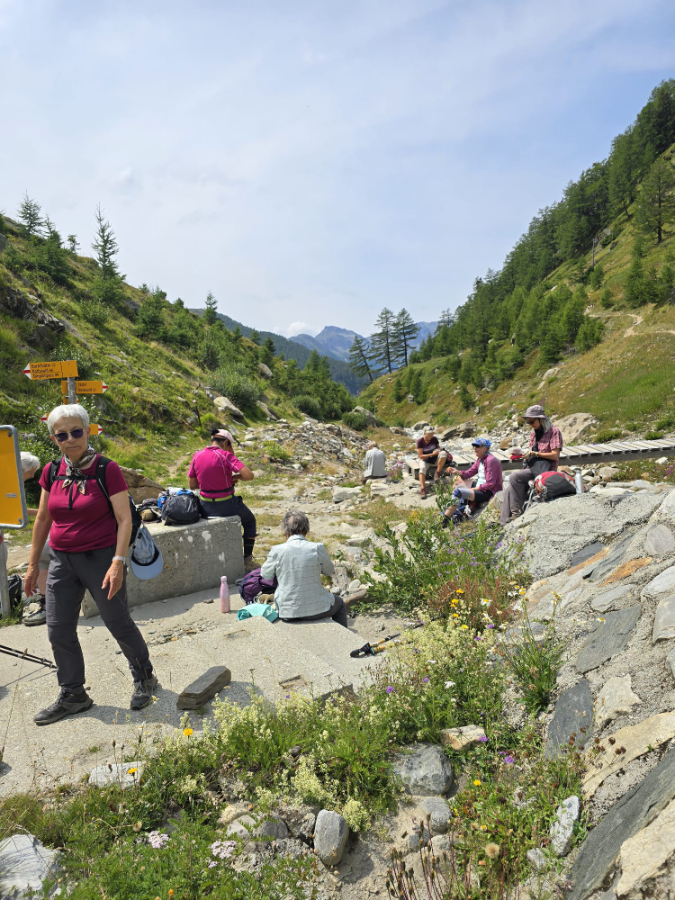 In Berisal begann unsere heutige Wanderung unter der Leitung von Marianne Sarbach. Eine gutgelaunte Gruppe nahm den Weg unter die Füsse und bewegte sich auf leicht ansteigendem Pfad Richtung Bortel. Bei idealem - zwar etwas «düppigem» und entsprechend schweisstreibendem - Wetter führte der Weg zur Alp Steinumatte. Nach kurzer Rast am Ganterbach/Furgguböumbach wurde der Weg beträchtlich steiler; schliesslich galt es die etwa fünfhundert Meter Höhendifferenz bis zur Bortelhütte zu überwinden. Bei diesem Aufstieg wurden wir durch Ausblicke auf das Gantertal mit der imposanten Ganterbrücke, das Belalpgebiet, auf die Berner Alpen und das Rhonetal belohnt. Bald erreichten wir die Bortelhütte, wo wir freundlich empfangen wurden. Nach der wohlverdienten Stärkung wanderten wir auf anspruchsvollem Bergpfad zur Steinualpe und dann auf leicht ausgesetztem Weg zur Stafelalp. In der schlichten Kapelle gab es Gelegenheit für eine kurze Andacht, den Gesang von Dona Nobis Pacem und auch ein währschafter Jutz durfte nicht fehlen. Dem gemütlich gurgelnden Bärgwasser entlang ging es nun dem Tagesziel Rosswald entgegen. Ein wunderschönes Wandererlebnis erfuhr hier seinen Abschluss. Danke Marianne für die kundige Führung – mach weiter so. Res