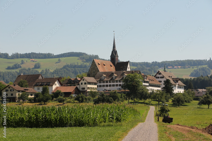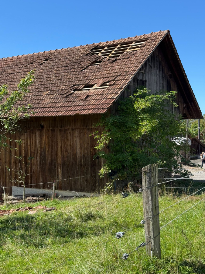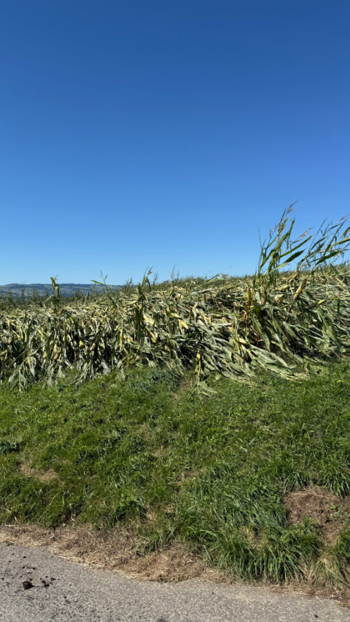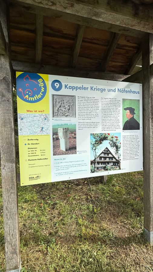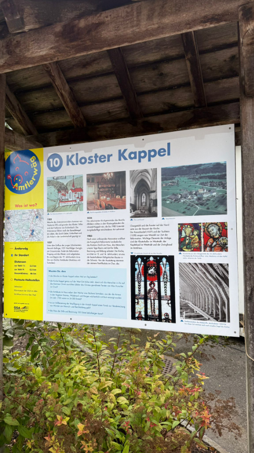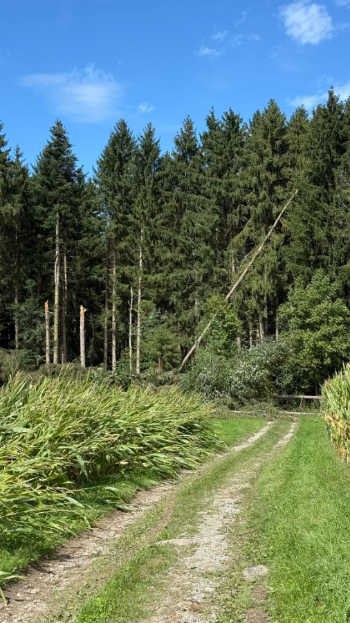 So gestärkt nehmen wir die Wanderung unter die Füsse und erreichten in gut 40 Minuten das Kloster Kappel. Gerade rechtzeitig, um der Glöcknerin beim Läuten der 11 Uhr Glocke zuzuschauen. Wir besichtigten die Kirche mit der Stephanskapelle, wo das Wappen der Familie Gessler von Bernegg Röby Lips zum Globi inspiriert haben soll, und danach den Kräutergarten, der säuberlich nach der Wirkungsweise der Kräuter angeordnet ist. Das Klosterrestaurant wartet auch mit einer Karte voller Köstlichkeiten auf. Wir aber ziehen weiter durch Feld und Wald Richtung Rifferswil. Die Sonne übernimmt immer mehr das Regiment und es ist bald warm. Unterwegs geniessen wir am Waldrand unser Picnic an der Sonne. Dann zwingt uns ein Sturmschaden im Wald zu einem Umweg. Wegen umgestürzten Bäumen ist da kein durchkommen. Vorbei an zerstörten Maisfeldern, entwurzelten Bäumen und teilweise abgedeckten Scheunendächern erreichen wir unser Wanderziel Knonau. Das Restaurant im Dorf hat leider am Nachmittag geschlossen und eine Gruppe entschliesst sich sofort via Zürich heimzureisen. Den andern ist das noch zu früh und fahren nach Zug und geniessen dort einen Aufenthalt mit Zuger Kirschtorte, Kaffee u.a.m.. am See, bevor sie über Luzern nach Bern heimreisen.