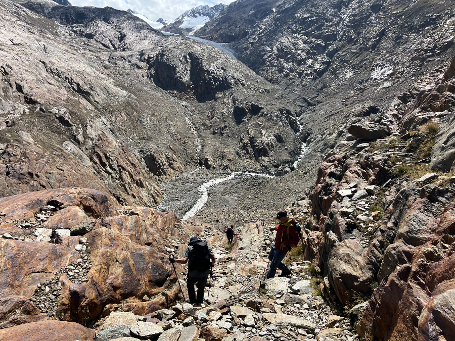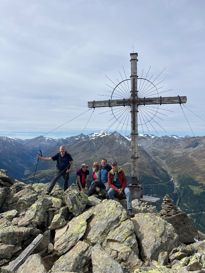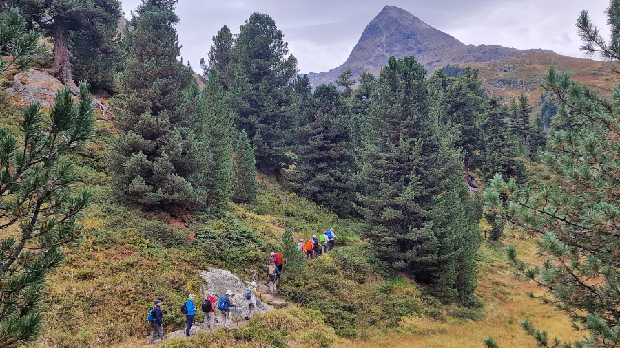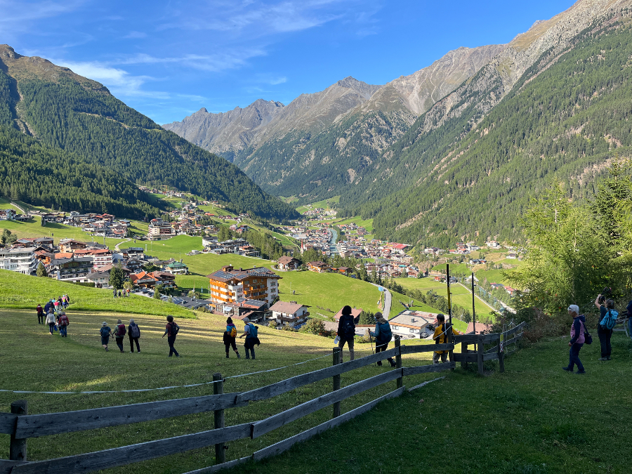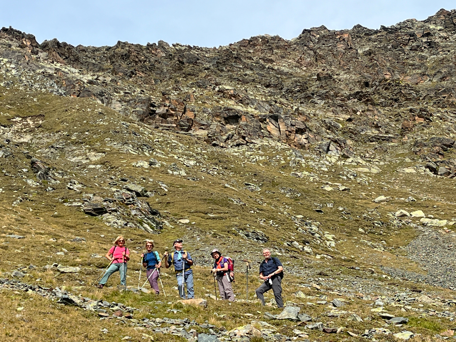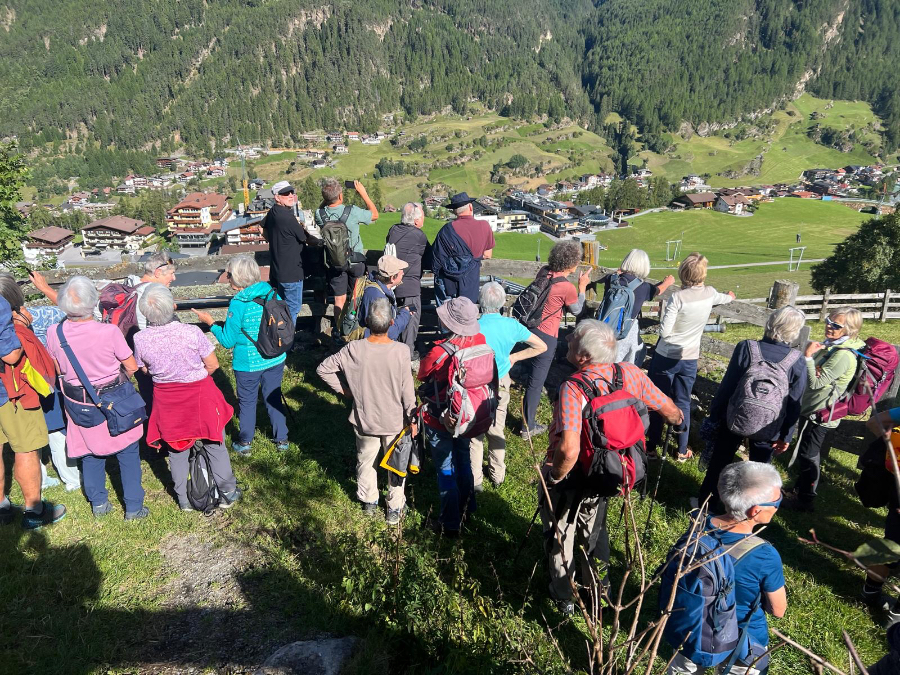 Nun, wir weilten nicht zum Skifahren im Ötztal, sondern zum Wandern – und kamen voll auf unsere Rechnung. Das rund 65 Kilometer lange Tal ist ein Wandergebiet par excellence mit unzähligen Bergwegen zwischen der Ortschaft Oetz am Taleingang und dem Timmelsjoch, dessen Passübergang ins Südtirol führt. Das Leiterteam hatte buchstäblich die Qual der Wahl, die schönsten und lohnendsten Wanderrouten für die 40 Teilnehmenden auszuwählen.