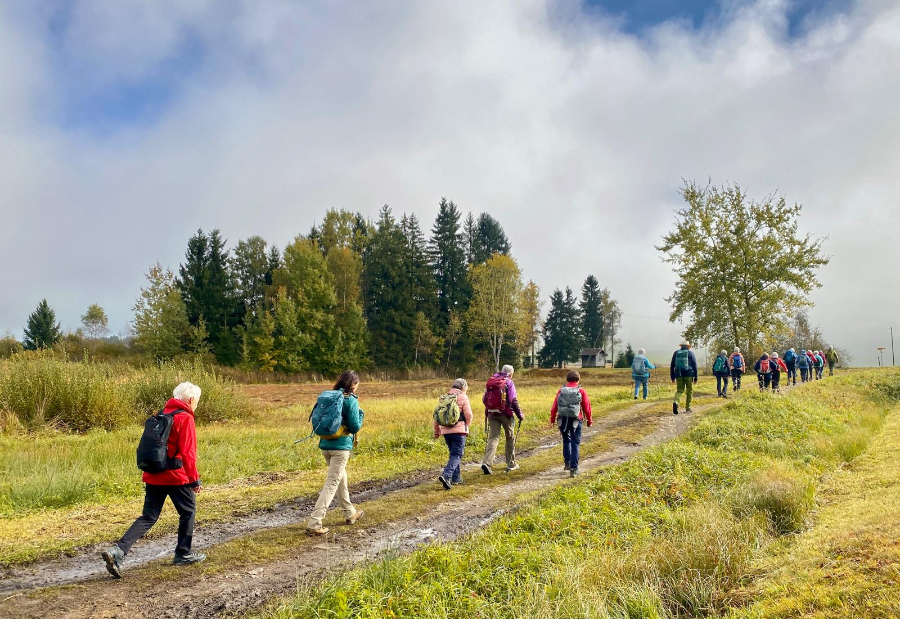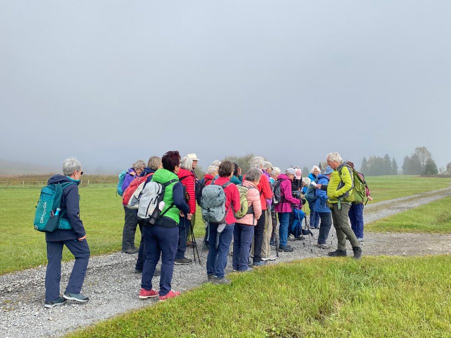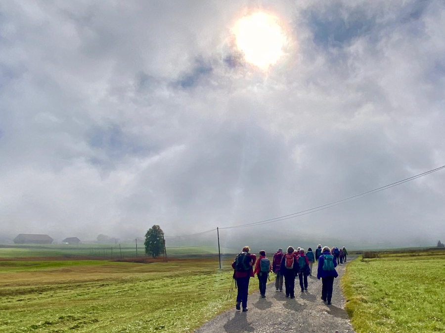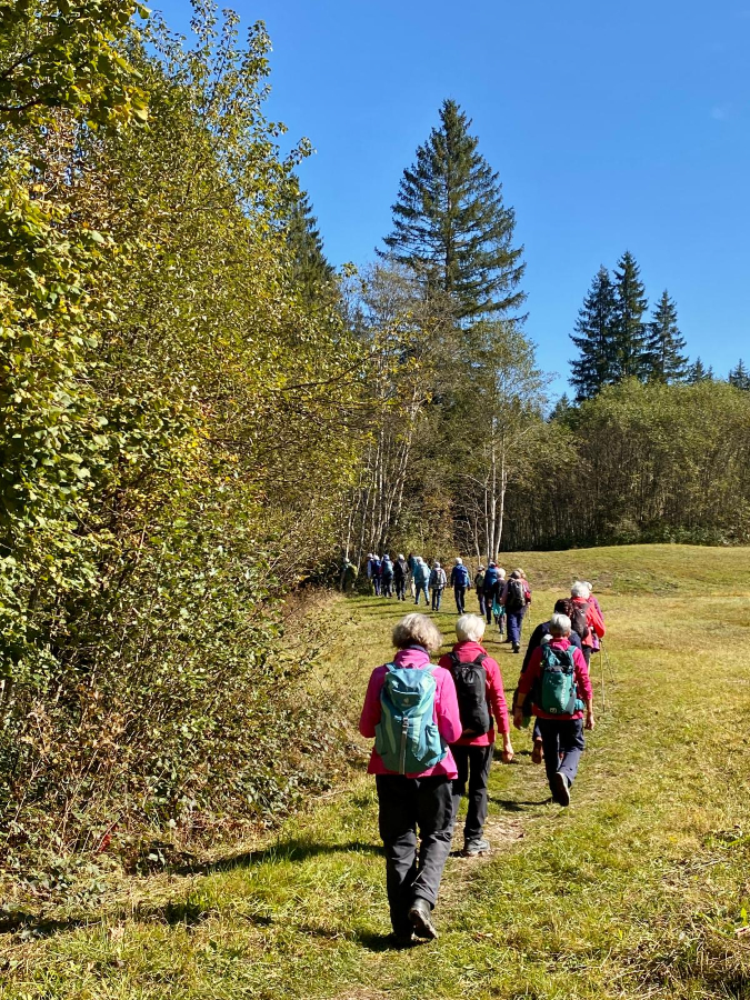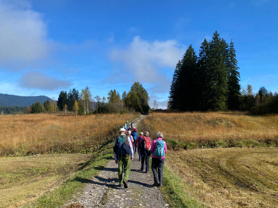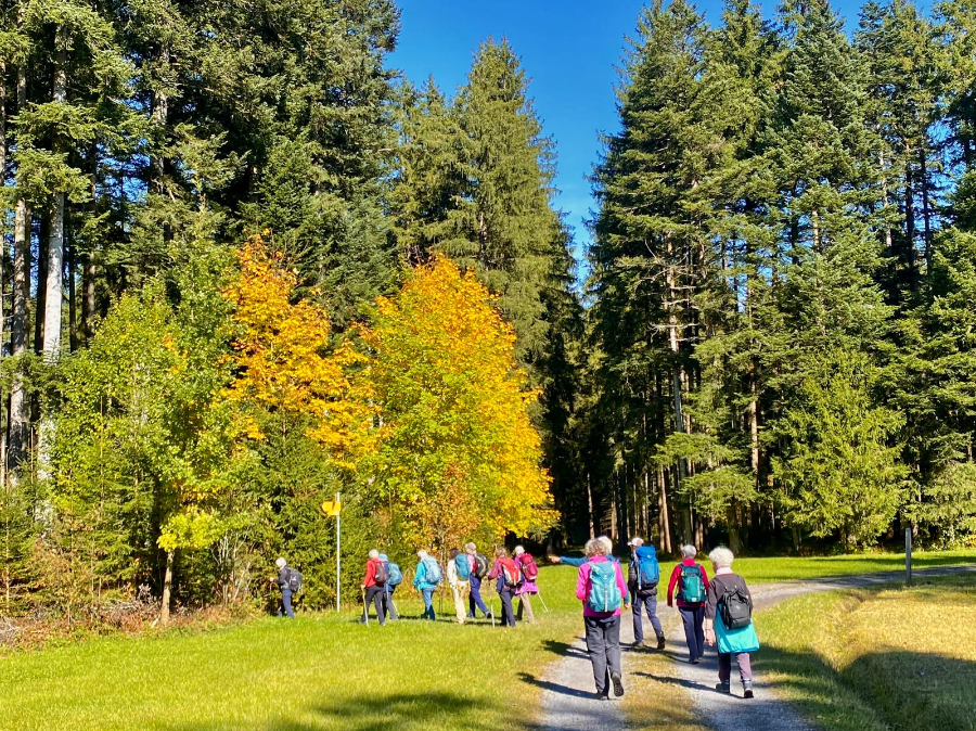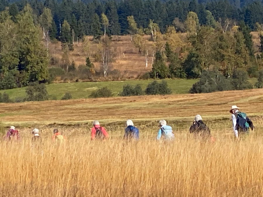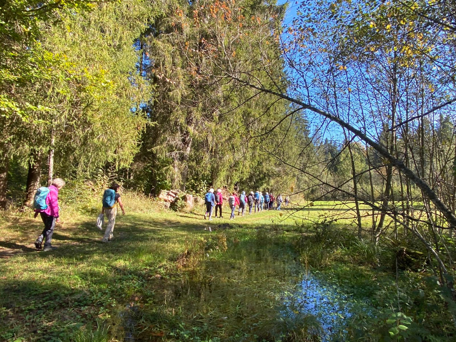 Wenn 1987 die sogenannte Rothenthurminitiative vom Stimmvolk abgelehnt worden wäre, würden wir an diesem schönen Herbsttag nicht durch das Hochmoor von Rothenthurm wandern. Es wäre ein Waffenplatz für die Schweizer Armee entstanden und das Hochmoor für alle Zeiten zerstört worden. Heute dürfen wir uns an der Farbenpracht und an der mystischen Stimmung im Moor erfreuen. Nach dem Startkaffee in Rothenthurm wandern wir los. Bald schon lösen sich die Nebel auf und die Sonne lässt die Farben noch mehr leuchten. Zügig kommen wir voran und treffen unterwegs immer wieder auf das Flüsschen Biber, welches nach Bibersteg in ein tiefes Tobel verschwindet. Nach einer kurzen Mittagsrast beim Moorgebiet Hinterwijer führt der Weg im Wald steil bergab zum Wolfschachen. Viel Wurzelwerk erfordert unsere ganze Aufmerksamkeit. Es folgen noch weitere Abstiege bis wir beim Moor Allmig wieder auf der gleichen Höhe wie die Biber sind, die nun auf unserem Weg bis nach Biberbrugg immer in unserer Nähe ist. Im Hotel Post Biberbrugg geniessen wir unseren wohlverdienten Schlusstrunk und für die Heimreise kaufen wir Magenbrot und Biberfladen draussen beim Händler ein. In einem wunderschönen Gebiet durften wir eine abwechslungsreiche und interessante Wanderung machen. Wir danken Jürg Anliker ganz herzlich dafür.