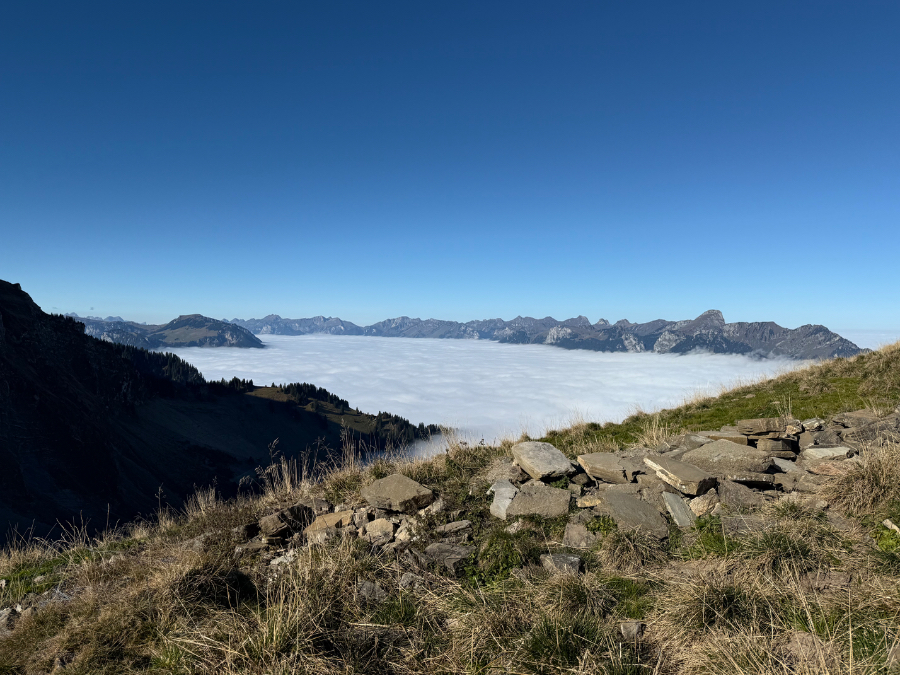Wir geniessen das schöne Panorama, die Berner Alpen, die über dem Nebelmeer herausragen. Gut drin im Wander-Flow beschliessen wir, unser Picknick erst ganz oben einzunehmen. Aufsteigend marschieren wir weiter, auf einem schmalen Zick-Zack Bergweg. Kurz vor dem Restaurant Niesen erwarten uns noch einige hohe Stein- und Holzstufen. Angelangt am Ziel suchen wir uns zuerst einen freien Tisch auf der Terrasse und belohnen uns mit Getränken und mit feinem Kuchen.