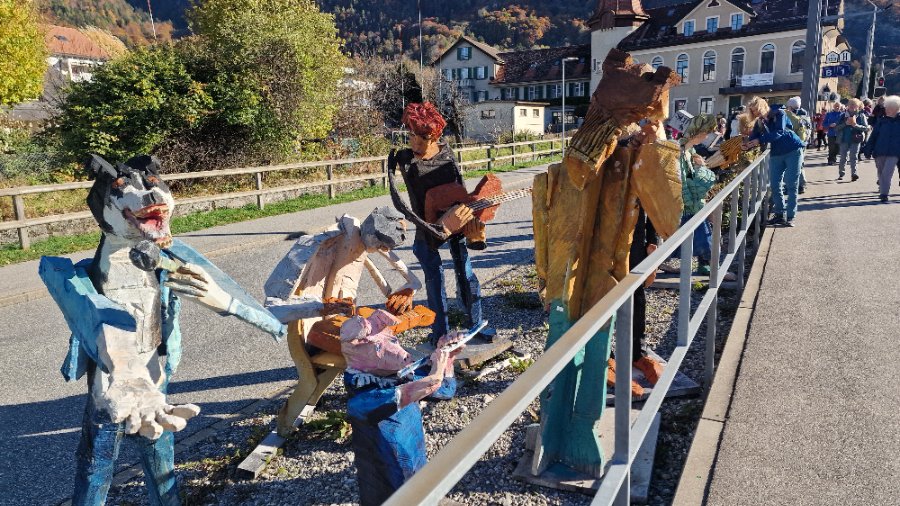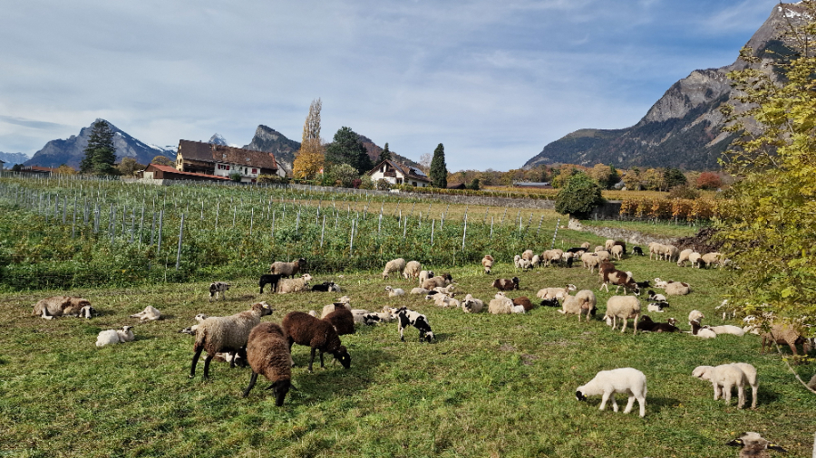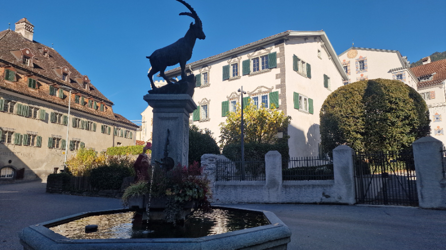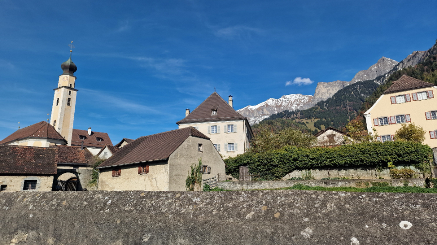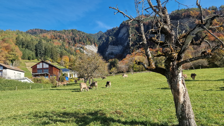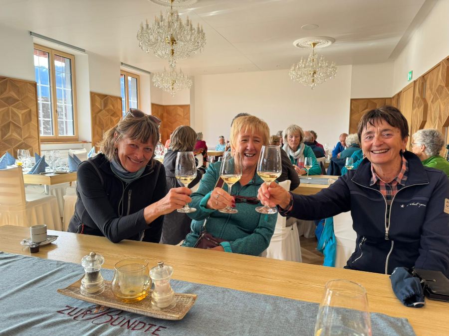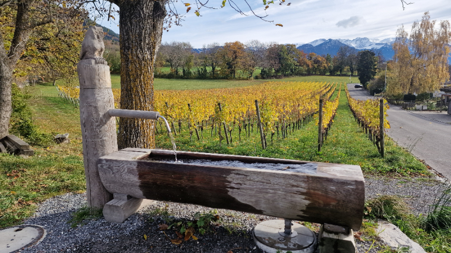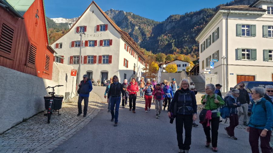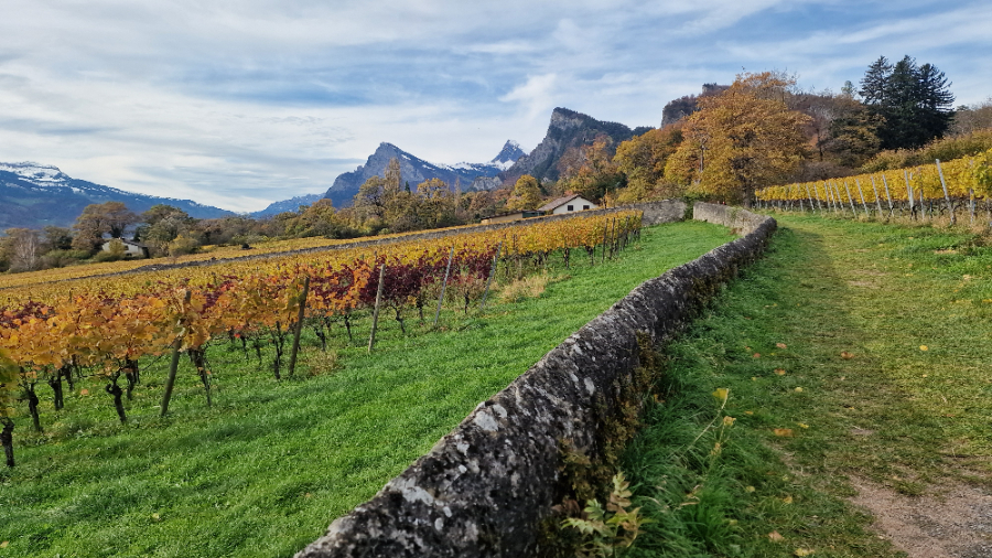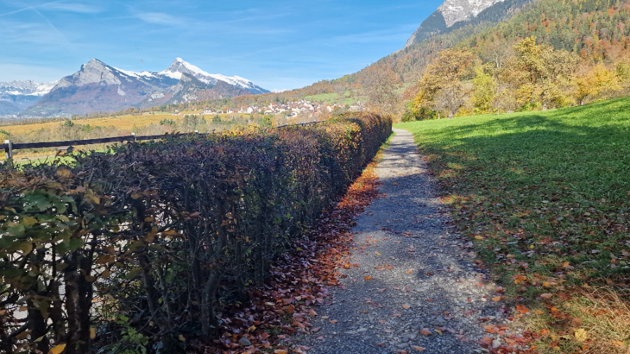 Blauer Himmel, Sonnenschein und ein kräftiger Föhnsturm empfangen uns in Malans. Nach dem Startkaffee wandern wir durchs Dorf mit seinen schönen Bündner Häusern und gelangen bald in die freie Natur. Wälder und Rebberge leuchten prächtig in den schönsten Herbstfarben. Hoch über den Dörfern steht die eine oder andere Burgruine, welche von der wechselvollen Geschichte der Bündner Herrschaft zeugen. Frisch verschneite Berge sind in der Ferne zu sehen und auf ihren Gipfeln bläst der Föhn den Schnee in den Himmel. Oberhalb der Malanser Rebberge wandern wir durch den Buochwald, überqueren den Alpbach und erreichen zur Mittagszeit Jenins. Nach dem Picknick geniessen wir in einem schönen Restaurant den vorgezogenen Schlusstrunk, bevor wir uns wieder auf den Weg in Richtung Maienfeld machen. Der Föhn bläst nun immer stürmischer und der Himmel beginnt sich zu verschleiern. Durch Rebberge, über Wiesen, auf denen mächtige Laubbäume stehen, wandern wir weiter. Unterwegs machen wir eine kurze Rast beim Heidibrunnen, der zum Gedenken an Johanna Spyri errichtet wurde. Gut durchgelüftet vom Föhn erreichen wir Fläsch.
