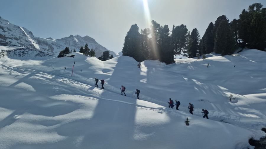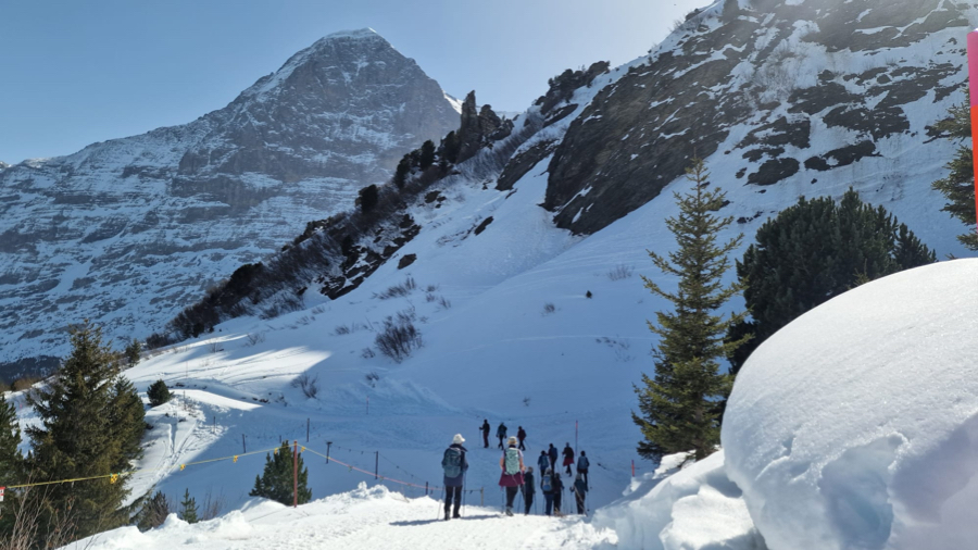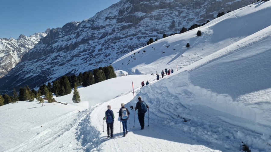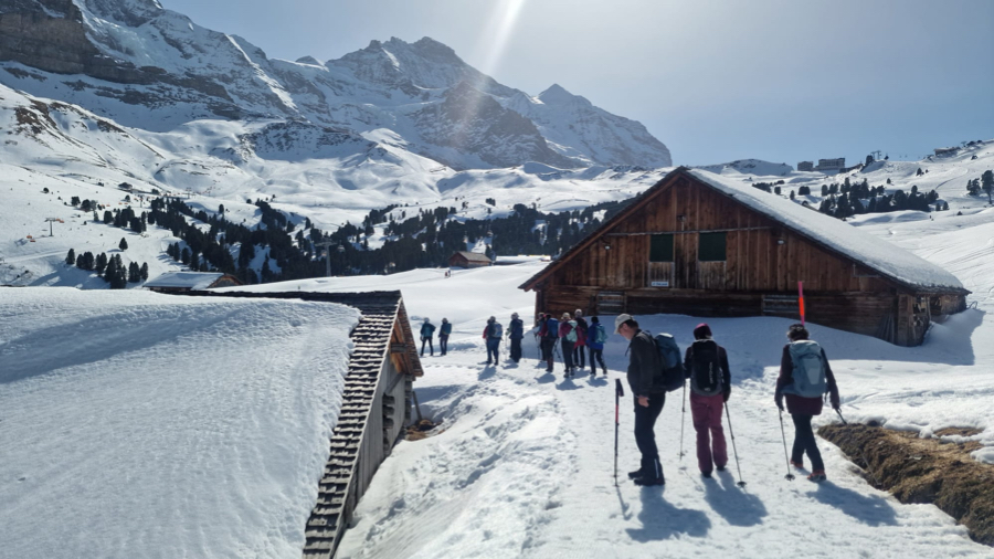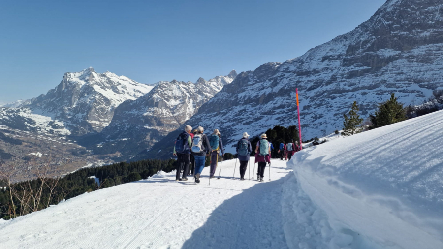 Der Startkaffe auf der sonnigen Terrasse des Bergrestaurants Männlichen schmeckte uns nach dieser ersten Anstrengung umso besser und gestärkt starteten wir anschliessend den eigentlichen Winterwanderweg. Anfangs teilten wir uns den Weg teilweise mit Schlittlern und Skifahrern, aber die grössere Herausforderung waren die zum Teil ziemlich steilen und rutschigen Wegstücke bergab. Zum Glück meisterten alle Teilnehmenden auch diese mit Bravour. Bei kurzen Halten bewunderten wir immer wieder das imposante Dreigestirn Eiger, Mönch und Jungfrau und unzählige andere 3000-er und 4000-er.