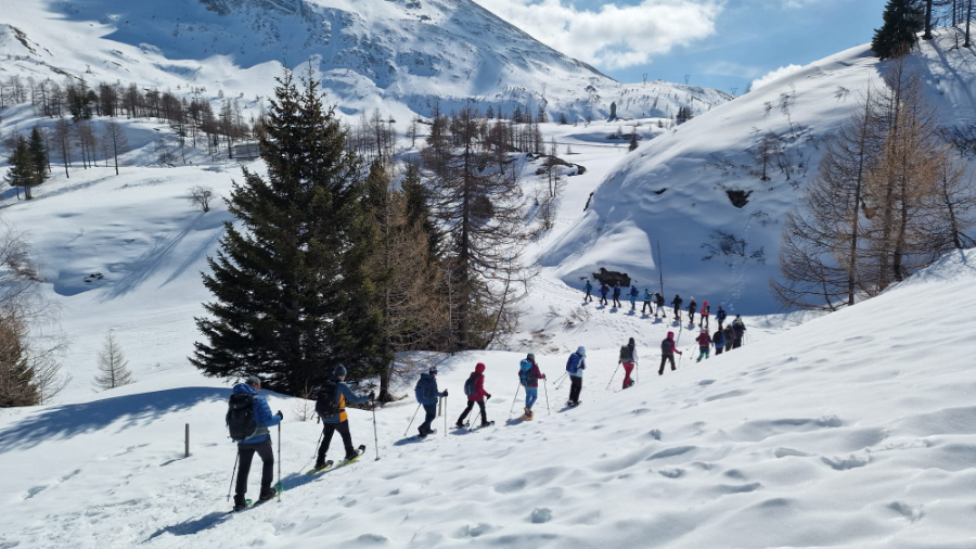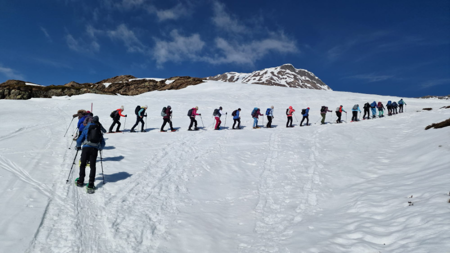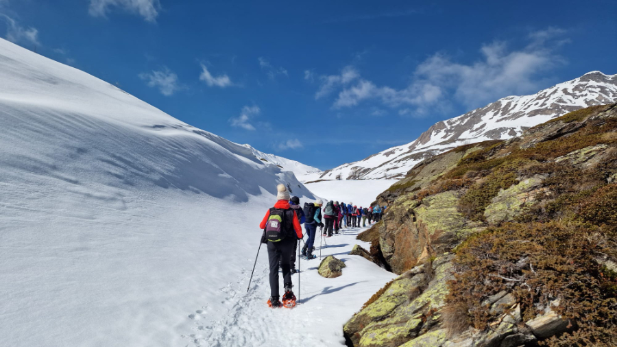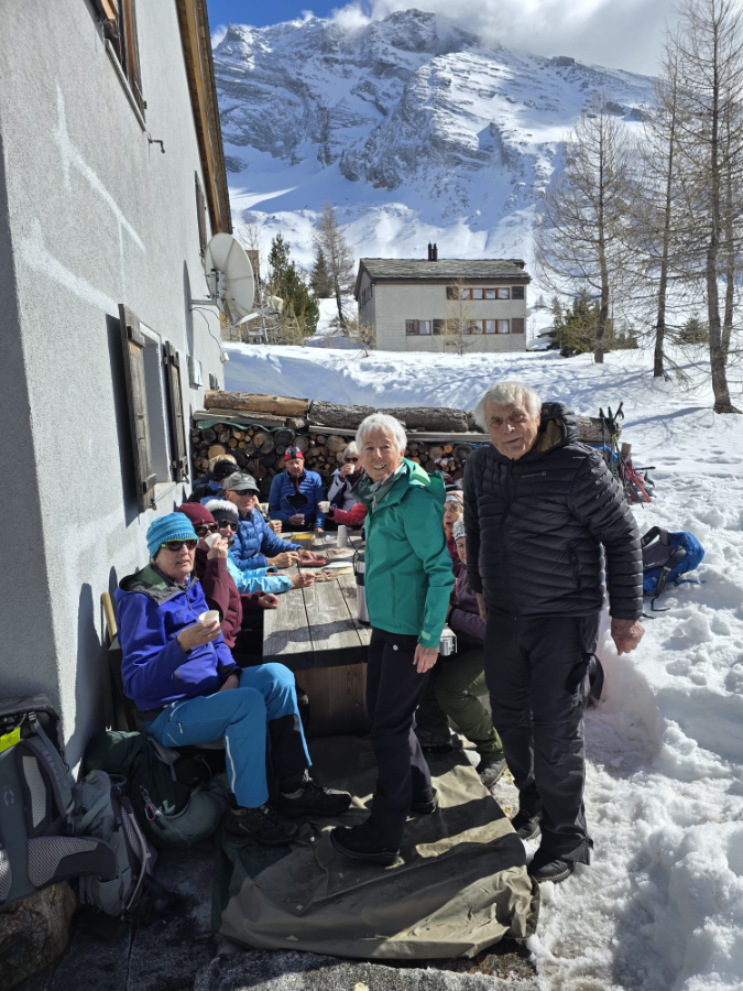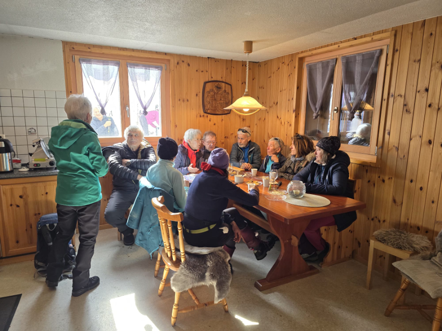 Trotz verspäteter Ankunft des Zuges aus Bern brachten uns die Busbetriebe fast fahrplangerecht zum Ausgangspunkt der heutigen Wanderung auf dem Simplonpass. Im Hotel Monte Leone stärkten wir uns, wie üblich, vor dem Einstieg in die Wanderung mit Kaffee und Gipfeli. Die Wandergesellschaft zeigte sich bei bester Laune, was ja bei diesem prächtigen Wetter eine Selbstverständlichkeit ist. Unter der kompetenten Leitung von Marianne Sarbach, tatkräftig unterstützt von ihrem Ehemann Adolf, starteten wir auf dem Rundweg Richtung Staldhorn. Auch hier herrschen nicht gerade üppige, sondern für die Region eher karge Schneeverhältnisse. Vormittags sind diese jedoch ideal zum Schneeschuhwandern. In den noch fast frostigen Nächten erhärtet sich nämlich der tagsüber sulzig gewordene Schnee, so dass das Wandern ein Leichtes ist. Bald erreichte die illustre Schar den höchsten Punkt der heutigen Wanderung, ziemlich genau unter dem Tochuhoru. Die Sonne wärmte schon mit beachtlicher Kraft und liess uns die dem Simplongebiet eigenen Windverhältnisse vergessen. Nach kurzer Trinkpause wanderten wir Richtung Hopschelsee und erreichten bald nachher einen windgeschützten Ort für die Mittagsrast. Nachher führte uns Marianne zum Steinadler, dem Symbol der Wachsamkeit und Wahrzeichen des Simplonpasses. Auf dem Sockel findet sich die Inschrift: «In der Freiheit der Berge steht es. Ein wichtiges Mal aus hartem Granit. Ein Gedenken treuer Pflichterfüllung. Ein dauerndes Mahnen, willig und wach zu sein für unsere Freiheit». Kurze Zeit später erreichten wir das Tagesziel beim Sommersitz von Hans und Berti Michlig (Hans ist ein Bruder von Rudi Michlig). Hier wurden wir mit warmem Wein, Hobelkäse, Weisswein, Teewein und selbstgebackenen Köstlichkeiten grosszügig verwöhnt. Viel zu früh mussten wir die gemütliche Stimmung verlassen um uns rechtzeitig bei der Busstation einzufinden. Schliesslich wurde der Fahrplan schon am Vormittag ganz gehörig zu unseren Gunsten strapaziert. Inspiriert von einem tollen Wandererlebnis in prächtiger Bergwelt traten wir die Heimreise an. Herzlichen Dank Marianne und Adolf für die motivierende Art der Wanderleitung sowie Hans und Rudi Michlig und Hanspeter Arnold für den grosszügigen Empfang. Res Bolliger