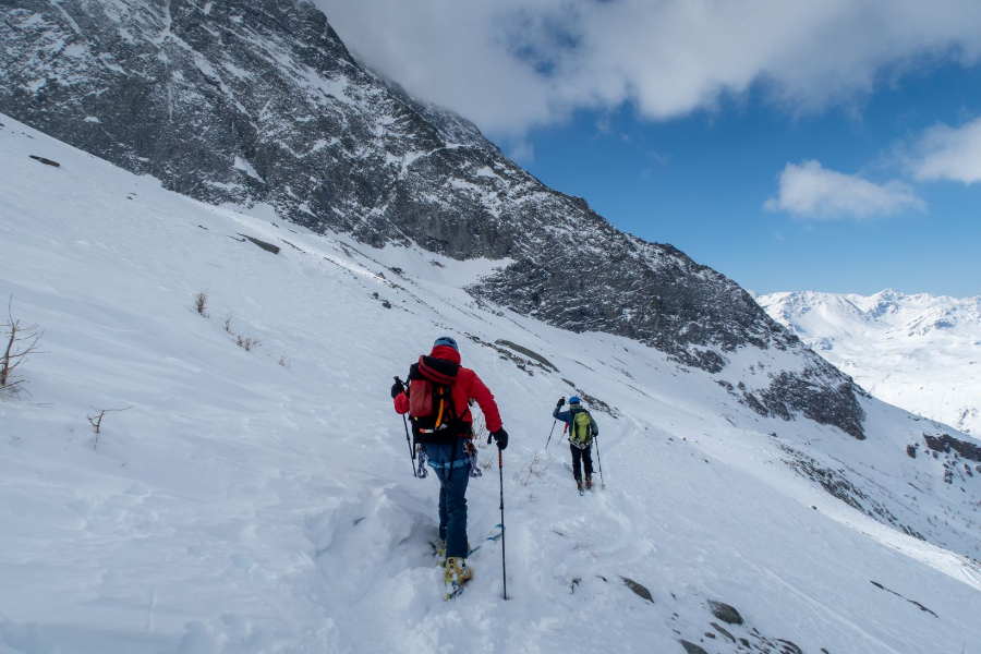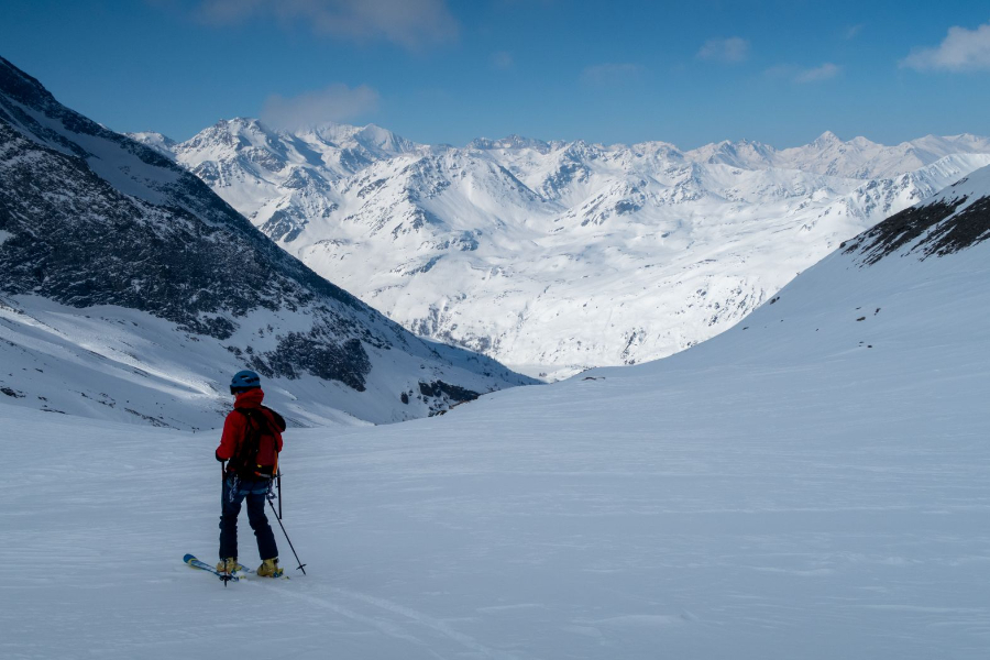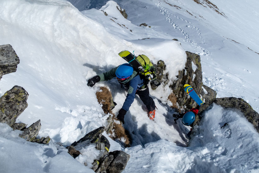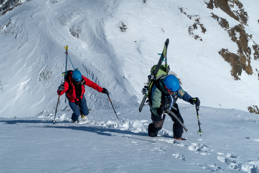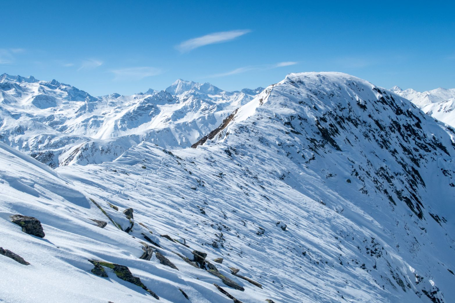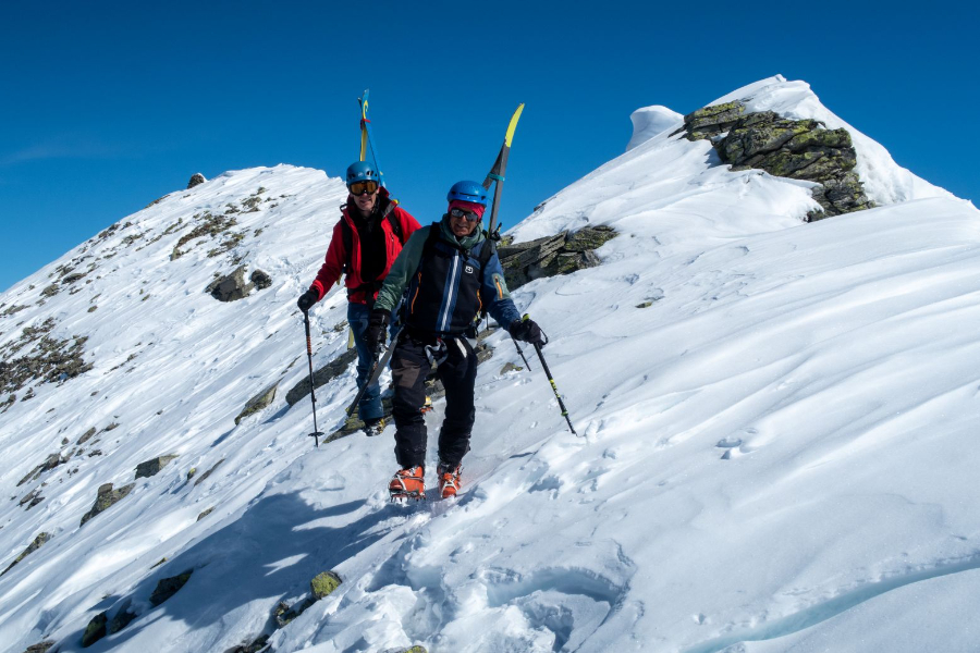 Am Freitag durften wir bei super Wetterbedingungen vom Monte Leone losziehen. Zusammen mit Stefan und Beat ging es mit den Ski in Richtung Tochuhorn, bis wir den Einstieg des Ost-Nordost-Grates erreichten. Mit Steigeisen, Pickel und aufgebundenen Ski stiegen wir durch Fels und Schnee steil hinauf, bis wir den Grat erreichten. Hier war das technisch schwierigste bereits geschafft, die Überschreitung bot puren Genuss in spektakulärem Gelände. Vom Tochuhorn fuhren wir in Richtung Westen ab, um anschliessend auf den Strafulgrat aufzusteigen. Auch von hier genossen wir eine tolle Aussicht auf Fletschhorn, Mischabelgruppe, Weisshorn und unzählige weitere Gipfel. Die Abfahrt zum Monte Leone war auf Grund von teils sehr geringer Hangneigung und schwierigen Schneeverhältnissen eher mühsam, wurde aber dennoch genossen.