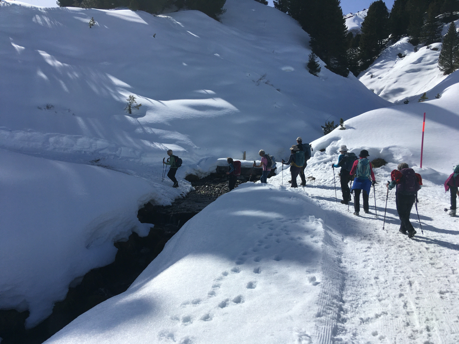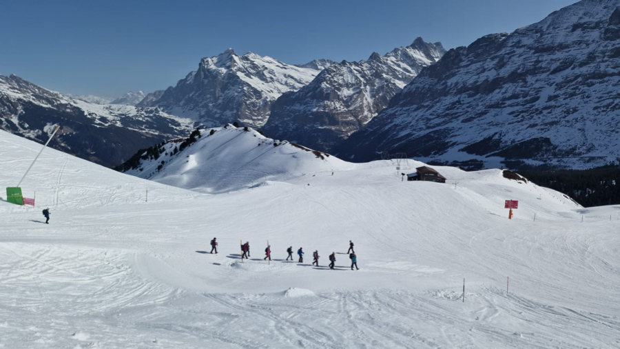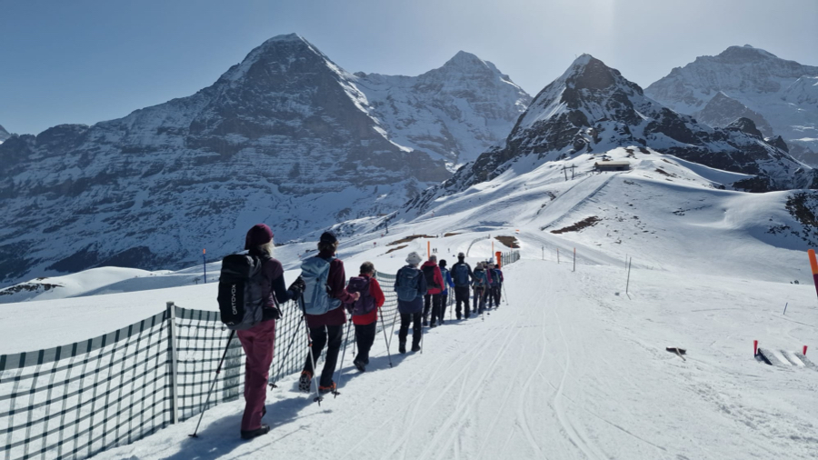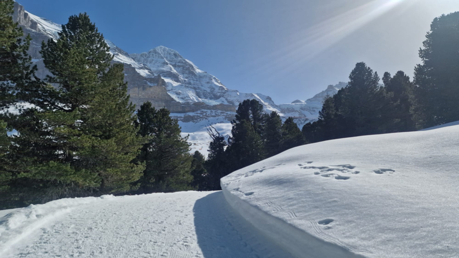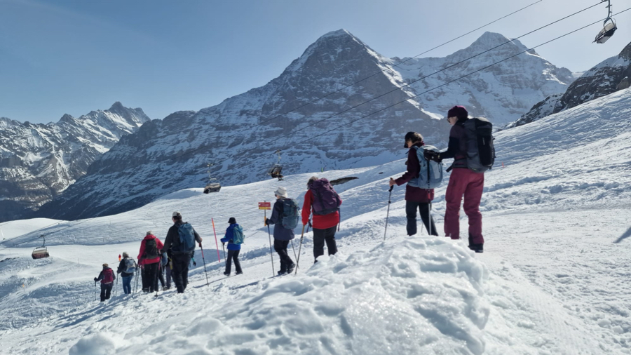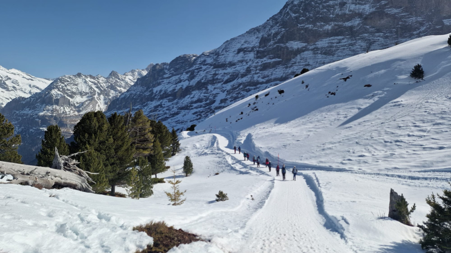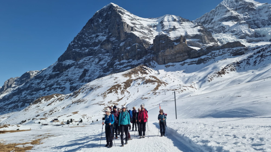 Der Startkaffe auf der sonnigen Terrasse des Bergrestaurants Männlichen schmeckte uns nach dieser ersten Anstrengung umso besser und gestärkt starteten wir anschliessend den eigentlichen Winterwanderweg. Anfangs teilten wir uns den Weg teilweise mit Schlittlern und Skifahrern, aber die grössere Herausforderung waren die zum Teil ziemlich steilen und rutschigen Wegstücke bergab. Zum Glück meisterten alle Teilnehmenden auch diese mit Bravour. Bei kurzen Halten bewunderten wir immer wieder das imposante Dreigestirn Eiger, Mönch und Jungfrau und unzählige andere 3000-er und 4000-er.