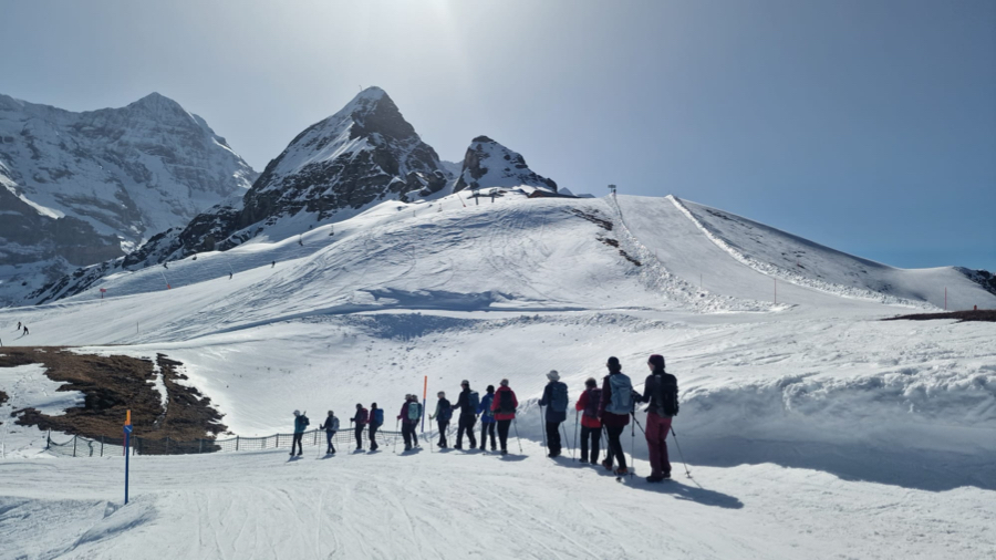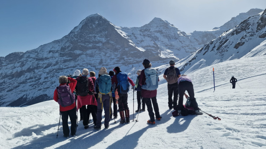 Beim vierten Anlauf (nach Alternativprogrammen im 2023 und 2024 aufgrund des gesperrten Winterwanderweges und einem ersten Versuch in grösstenteils nebligem Wetter im 2025) präsentierte sich uns dieses Jahr das herrliche Panorama des Winterwanderweges Männlichen - Kleine Scheidegg in fast makelloser Märzsonne – einzig der Saharastaub trübte die Sicht ein bisschen. Daher wollte sich auch niemand die Sicht vom Männlichen-Gipfel nehmen lassen. Alle stiegen freiwillig direkt nach der Fahrt mit der Luftseilbahn und vor dem Startkaffee die dafür erforderlichen 124 Höhenmeter hinauf. Mir schien, dass es niemand bereute...