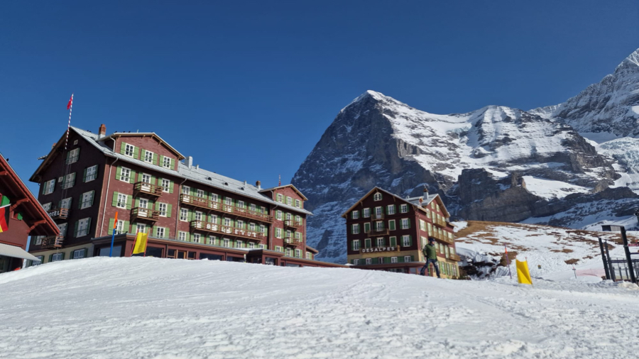 Nach den ersten Pistenüberquerungen führte uns der Weg dann in die Abgeschiedenheit der Arvenwälder, wo wir auch unseren Mittagsrast genossen. Mit leichterem Rucksack, dafür etwas besser gefülltem Bauch, ging es nun fast nur noch bergauf. Doch obwohl die Kleine Scheidegg zuerst erschreckend weit weg und hoch oben wirkte, erreichten wir sie erstaunlich schnell. Auf der Terrasse des Restaurants Bahnhof freuten wir uns nochmals über die beeindruckende Winterbergwelt bei strahlendem Sonnenschein.