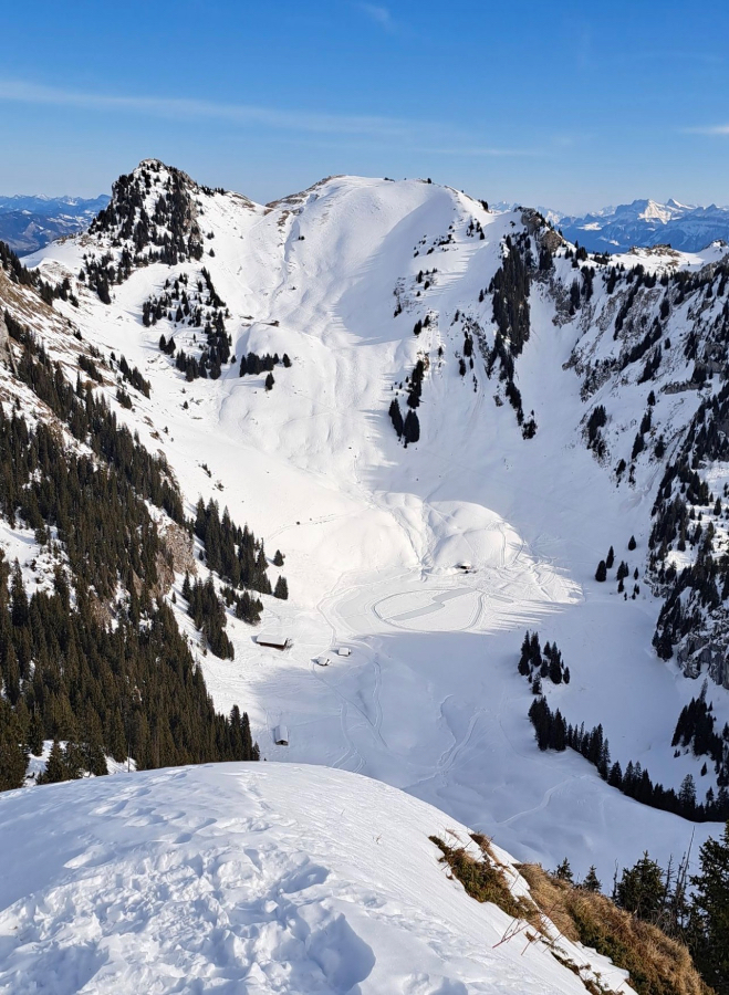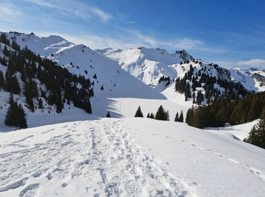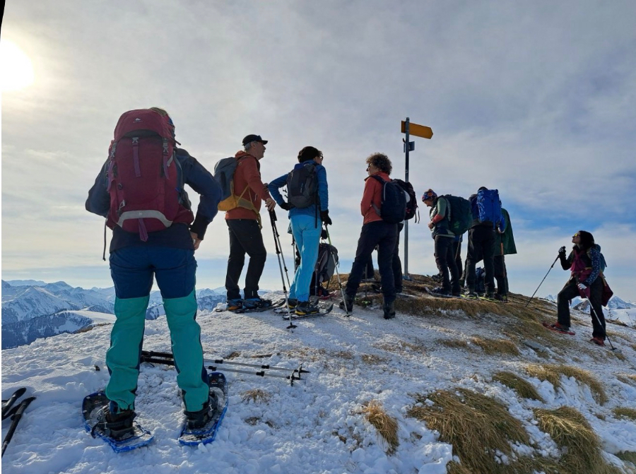 Die Sonne lachte, als wir uns am 20. Januar 2026 auf unsere Schneeschuhtour um und aufs Cheibenhorn begaben. Die Stockhornbahn führte uns hoch zur Mittelstation Chrindi. Von da führte der Weg erst hinunter zum zugefrorenen Hinterstockensee und danach stetig hoch zum Cheibenhorn. Dieses bestiegen wir mit Ausnahme von zwei der elf Teilnehmenden. Von da genossen wir einen wunderbaren Rundblick auf die Berge des Berner Oberlands bis hin ins Wallis. Nach dem Abstieg im genügend vorhandenen Schnee hielten wir Mittagsrast bei einer Berghütte auf Vorderstocken. Gut gestärkt stiegen wir hinunter zum Oberstockensee, überquerten das gefrorene Gewässer und stiegen danach wieder hoch zur Oberstockenalp. Das dortige Berggasthaus hielt leider Winterruhe, sodass wir nicht die Nussgipfel probieren konnten, von denen René so schwärmte in Erinnerung an einen Besuch einst im Sommer. Durch lichte Waldpartien führte der Weg hinunter zurück zum Hinterstockensee. Darauf bewegten sich Schlittschuhläufer und suchten ein paar Eisfischer ihr Fangglück. An der Bar beim Fondueiglu stärkten wir uns mit einem Heissgetränk vor dem Aufstieg zur Talfahrt hinunter nach Erlenbach im Simmental. Andreas Tschopp, Thun